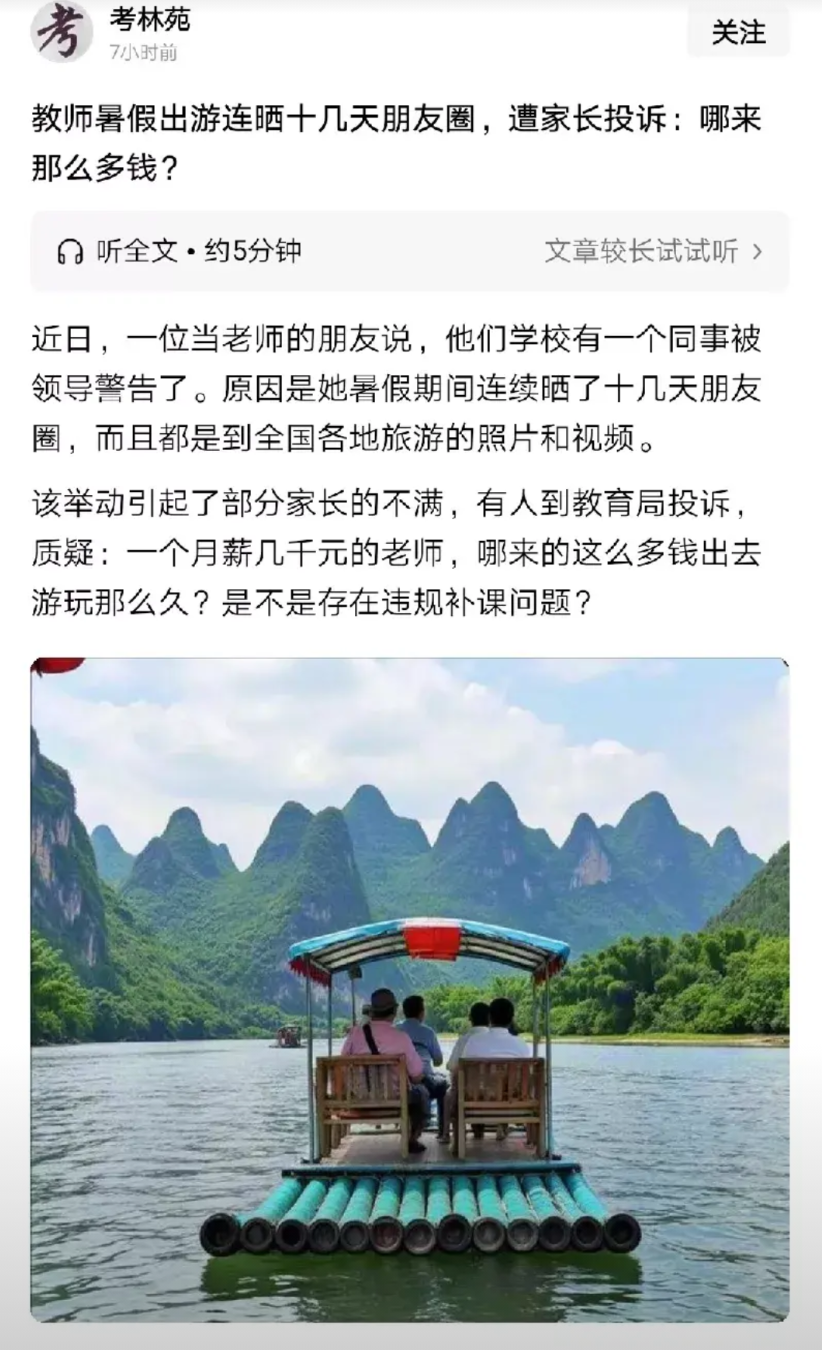 教师在朋友圈晒旅行照,这是教师的权利;教师如果把朋友圈开放给所有朋友,包括家长,有家长看了不满、举报,这也是教师控制不了的。 关键在于,教育部门、学校怎么对待举报,是不是因有举报就认定教师有问题,对于捕风捉影、没有事实依据的举报,不予以受理,这就是对举报的最好回应。