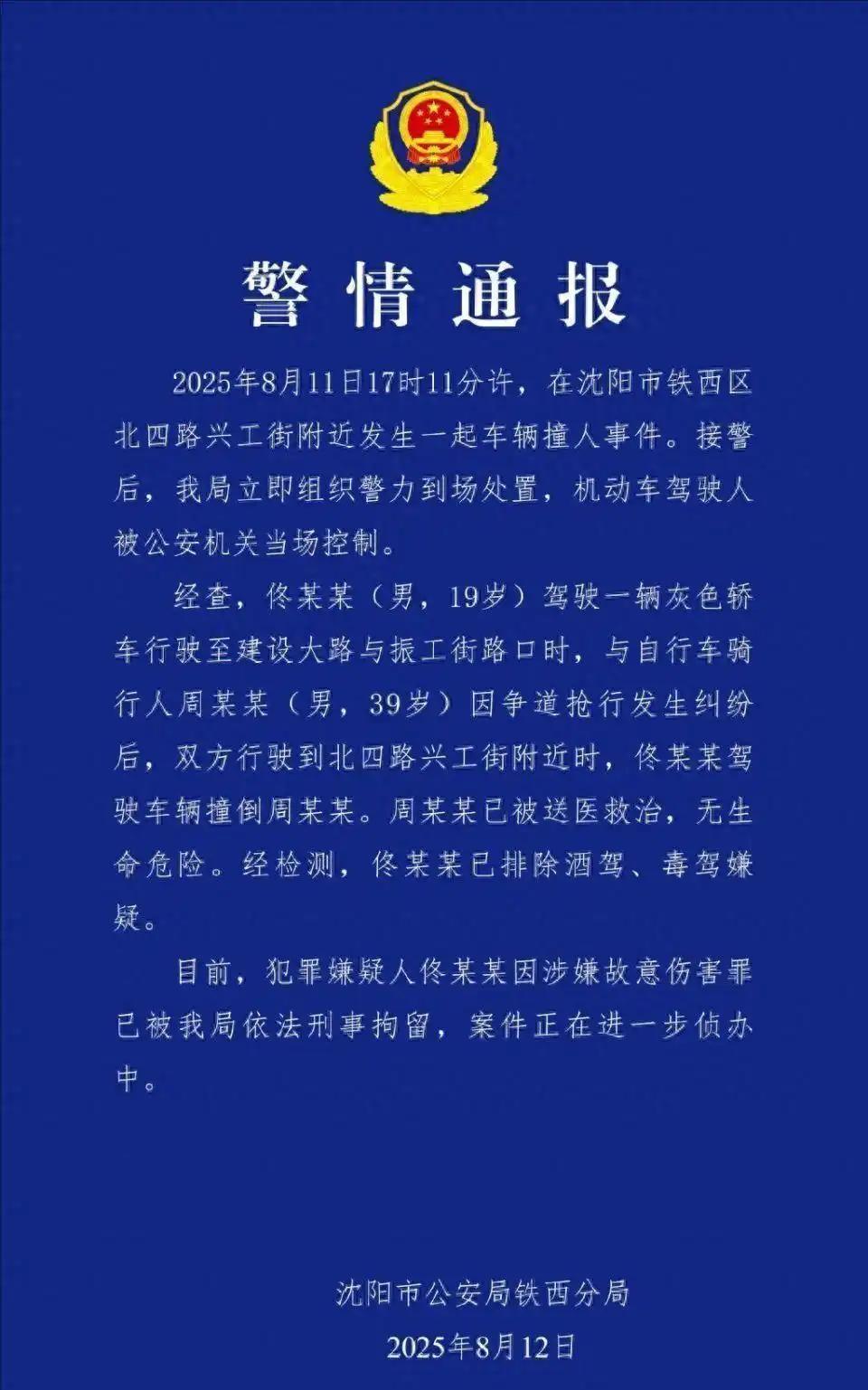 辽宁一19岁男子开车时被自行车“抢道”,进而引发冲突,竟开车连续不停撞击骑自行车的人,下车后还放话:“没人治你,00后治你! 8月11日,辽宁沈阳,19岁的佟某某开着一辆灰色的轿车行驶到建设大路与振工街路交汇处时,和骑着自行车的周先生发生了冲突。 佟某某称,当时是红灯,他要向右行驶,结果周先生竟然不看红灯抢道。他见状只好踩了急刹车让路。 孰料,周先生竟然回头瞪了他一眼。年少气盛的佟某某打开窗户回骂了回去。 然后,双方就起了冲突。 周先生一边骑自行车一边拍打佟某某的车门。 谁知,佟某某竟然是个狠人,直接一边说脏话,一边开着车撞周先生。虽然速度不快,但他完全没有认为这种撞人行为有什么不对,一下,两下…… 一连撞了四五下,把对方都撞出血来了。 佟某某的行为让路人都看不下去了,纷纷劝说他得饶人处且饶人。 结果佟某某却只是一边说自己没做错,错的都是躺地下那个人,一边骂人,一边继续撞。 气消了之后,佟某某又从车上下来了,仍然不停地对着地上的周先生破口大骂,甚至放言:“没人治你,00后治你!” 警察很快就过来了,将佟某某带走调查。 好在,周先生虽然被撞了好几下,并没有生命危险。 而根据后续公开佟某某行车记录仪上的视频可以发现,当时红绿灯的确已经变成绿灯了。也就是说,周先生是在正常行驶,拐弯让直行是应该的。 如果说周先生做的有什么不妥的地方的话,那就是他是在斑马线上骑车过去的,而没有下车推行。 佟某某这种行为更像是他自己的没事找事的寻衅滋事。当然,也可能他是真没有注意到红绿灯的变化。 当然,就算周先生真的闯红灯了,也不是他开车多次撞人的理由。 佟某某已经犯了故意伤害罪,明明路人多次劝阻,他还是要不停地开车去撞人家,主观上就是故意伤害对方的身体健康,进而将对方撞出了血。 根据警方通告,目前他已经被刑事拘留。而定罪的关键证据,就是佟某某自己公开的行车记录仪……