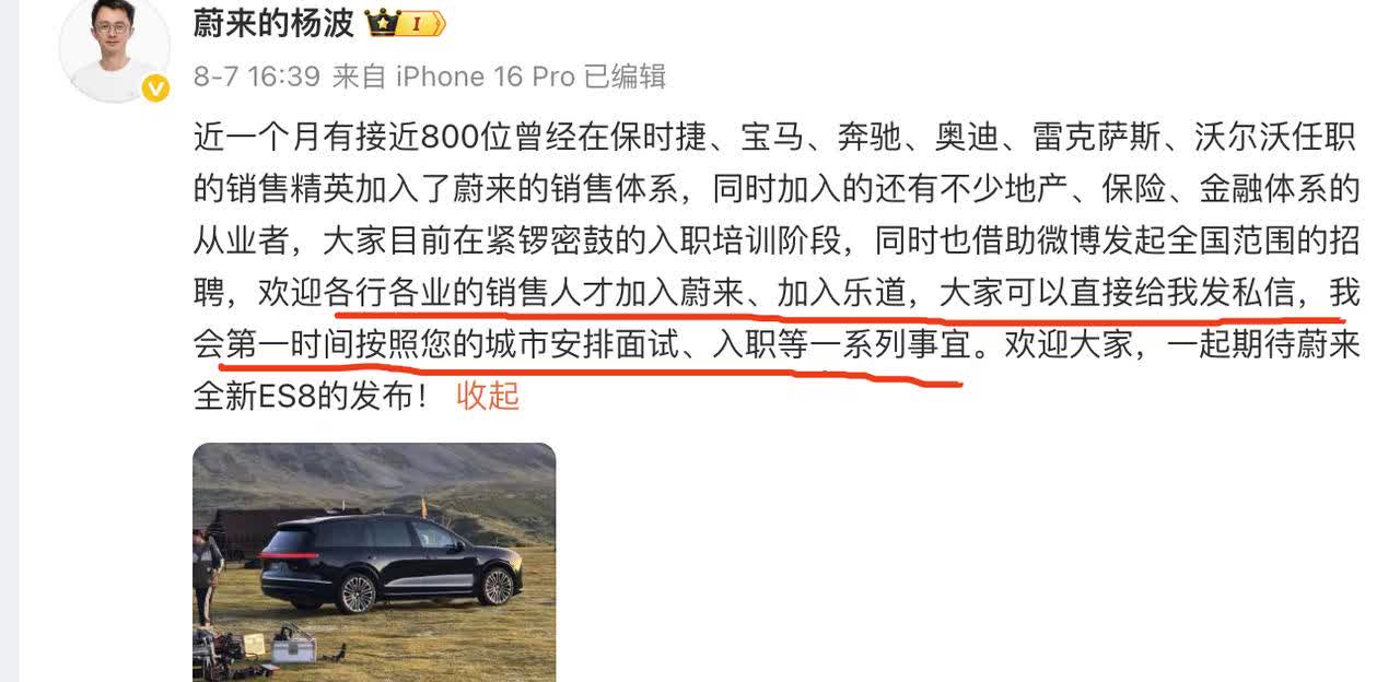 乐道和蔚来现在在大批招人 现在订单和销量都起来了 自然也比较缺人 现在应该是加入蔚来和乐道的好机会【来自懂车帝车友圈】