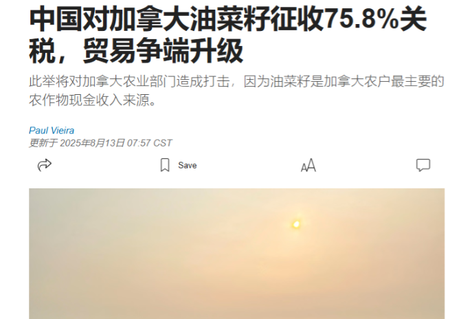 华尔街日报报道,中国对加拿大油菜籽征收75.8%关税,相信此举将对加拿大农民构成打击。