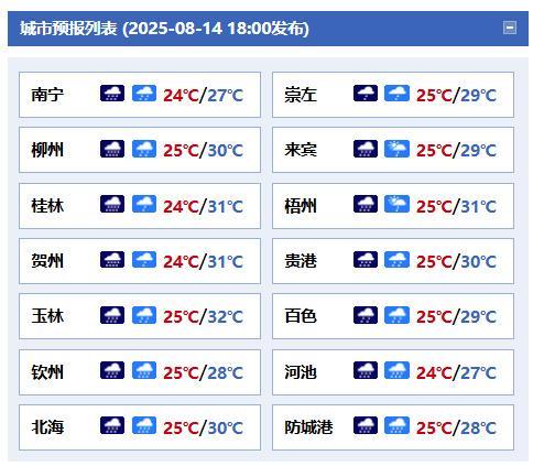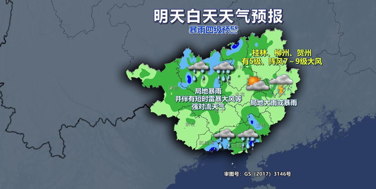 #广西天气#【“杨柳”低压携风带雨影响广西 局地雨势强劲】今天晚上,桂林、柳州、贺州、河池、来宾、钦州、北海、防城港等市以及南宁、贵港、玉林三市北部有大雨到暴雨、局地大暴雨或特大暴雨并伴短时雷暴大风等强对流天气,其它地区有小到中雨、局地大雨或暴雨。桂林、贺州两市有5~6级、阵风7~9级大风。 明天白天,柳州、河池、百色、玉林、钦州、防城港等市有中到大雨、局地暴雨并伴有短时雷暴大风等强对流天气,其它地区多云有阵雨或雷雨、局地大雨或暴雨。桂林、柳州、贺州三市有5级、阵风7~9级大风。 南宁市:今天晚上到明天白天,中雨到大雨、局地暴雨,东南风2~3级,最低气温24℃,最高气温28℃。 15日晚上到16日白天,桂西、桂南的部分地区有中雨、局地暴雨并伴短时雷暴大风等强对流天气,其它地区多云有阵雨或雷雨、局地大雨。 16日晚上到17日白天,沿海地区有阵雨或雷雨、局地大雨或暴雨,其它地区多云到晴局地有阵雨。(广西气象台14日17时发布预报)