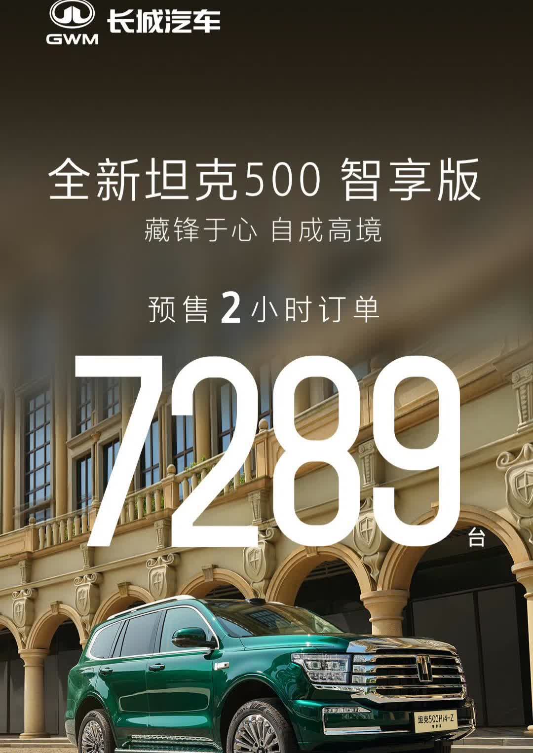1.1万台!坦克500智享版预售订单快报,预售2小时订单突破7289台,24小时订单突破11000台。 这里有一个前提,那就是坦克500是一台越野车,而且还是30多万价位的车,现在放出的500 Hi4-T智享版36万,Hi4-Z智享版38.88万,这个价格对应这个订单,在细分市场是相当优秀了。 订单多的原因,其一就是因为权益,现在订全新500是有3000订金抵8000尾款,也就是相当于优惠了5000;还有6000块的远红外夜视系统选装基金;价值8000元座椅按摩包等等,配置吸引力不小,所以很多人预售时期就下单了。 另一个原因就是改款改得很精准,从外观上看,全新坦克500智享版改动的不大,越野底蕴已经铺垫好了,包括耐久性这些,坦克500也是有环塔拉力赛量产组的参赛背景作为背书,所以改款更多是在豪华和智能层面进行拔高。 那越野车有没有必要加入智驾? 对于坦克500的部分消费者来说,是很有必要的,都说坦克500是“大哥座驾,老板座驾”,不少人是看中它的豪华属性,一个是强的气场和内饰豪华,一个是开起来要舒服轻松,这些是他们所看重的,所以全新坦克500智享版顺势就加入了智能化,标配了高速/城市NOA智慧领航辅助驾驶,车位到车位领航辅助,也能让用车更轻松;17.3英寸后排娱乐屏;智能冷暖双用冰箱。这些新势力有的冰箱彩电大沙发,坦克500智享版都集齐了,包括第一梯队的智能化加入,他也能和新势力抢市场了。