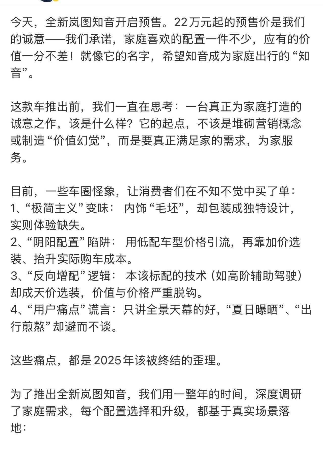 买车就怕“预售猛如虎,上市打折扣”?岚图高管这话让人踏实了 说实话,现在看新车总有点担心:预售时配置吹得天花乱坠,结果都是阴阳配置,想要啥都得加钱选装,特别是有些车我都不想点你名了……套路满满,真挺败好感的。 这次全新岚图知音预售,预售价格才22w起,配置看着确实顶,但心里也犯嘀咕:不会上市就变样吧?没想到岚图高管直接喊话:咱不搞那套虚的!配置表上有的,上市绝不暗改;用户需要的,咱直接标配,不搞弯弯绕绕的选装套路。不跟风抄作业,对自己的车有底气。 这话听着是真让人踏实啊。买车图的就是个明明白白,车企有这诚意和信心,咱选起来也放心多了~