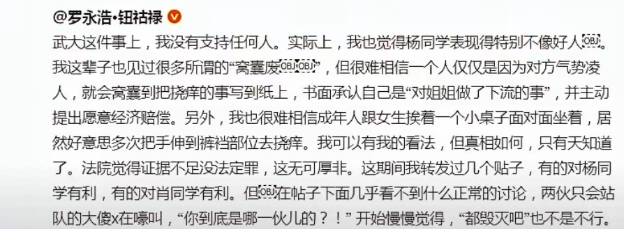 罗永浩发帖,辟谣自己支持武汉大学杨景媛,并表示没有删文……各位看官怎么看?[奸笑]