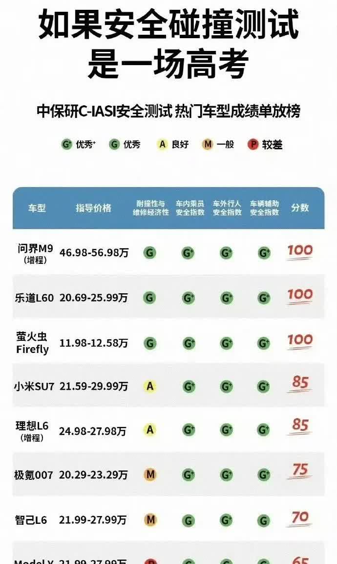 中保研C-IASI安全测试成绩一出直接给我看傻了 小米SU7居然不是满分? 问界M9乐道L6萤火虫Firefly都拿了100分 我米才85分 耐撞性和维修经济性还是个A 这结果也太离谱了吧 SU7这么顶的车怎么可能不是满分? 肯定是测试标准有问题 这榜单绝对不靠谱! 在我心里SU7就是安全性能天花板 这成绩我第一个不服!