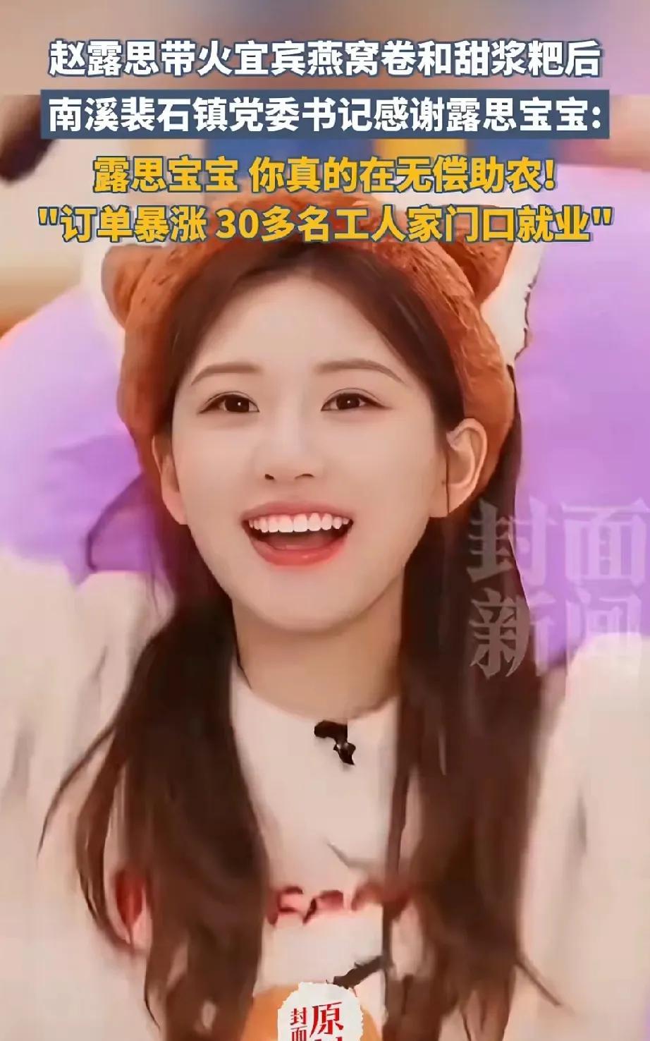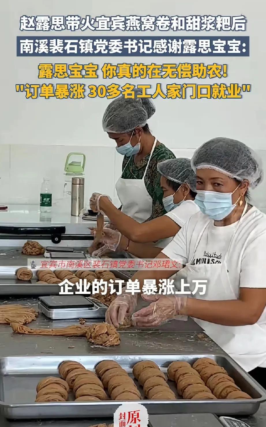 宜宾市南溪区裴石镇的燕窝卷和甜酱粑,被赵露思带火了,裴石镇党委书记表达了衷心的感谢。 裴石镇党委书记是一位女同志,她讲道,真的特别感谢赵露思无偿助农,现在,不但让燕窝卷和甜酱粑出了圈,还增加了30个就业岗位。 赵露思退出演艺圈后,开始通过网络直播无偿助农,她的人气迅速上涨,得到了广大网友的支持与称赞。 希望她尽快好起来,希望她发展得越来越好。