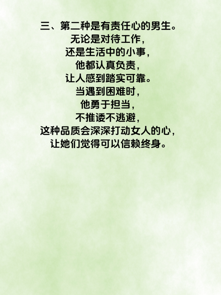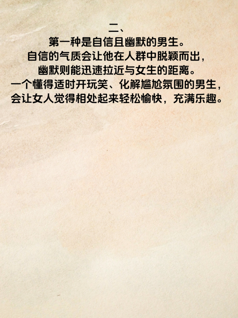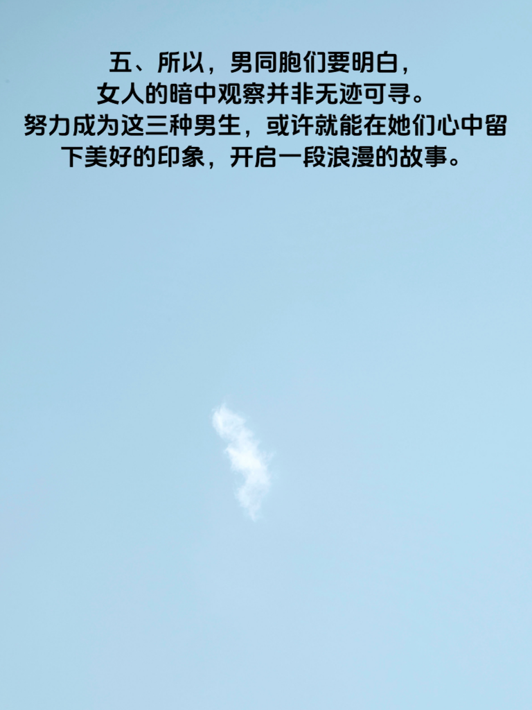 一、女人常常在暗中观察着男生的一举一动,她们的心思细腻而微妙。其中,有三种男生特别容易吸引她们的目光。 二、第一种是自信且幽默的男生。自信的气质会让他在人群中脱颖而出,幽默则能迅速拉近与女生的距离。一个懂得适时开玩笑、化解尴尬氛围的男生,会让女人觉得相处起来轻松愉快,充满乐趣。 三、第二种是有责任心的男生。无论是对待工作还是生活中的小事,他都认真负责,让人感到踏实可靠。当遇到困难时,他勇于担当,不推诿不逃避,这种品质会深深打动女人的心,让她们觉得可以信赖终身。 四、第三种是懂得尊重他人的男生。他尊重女人的想法、感受和选择,不会强行将自己的观点加诸于人。在交流中,认真倾听对方的意见,给予充分的理解和支持。这样的男生,会让女人感受到被尊重,从而心生好感。 五、所以,男同胞们要明白,女人的暗中观察并非无迹可寻。努力成为这三种男生,或许就能在她们心中留下美好的印象,开启一段浪漫的故事。