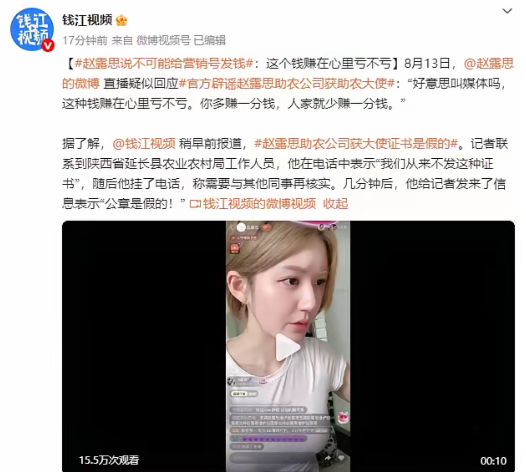 太精彩了,赵露思和钱江媒体杠起来了。 起因是钱江媒体发了一条赵露思假助农的博文,然后赵露思直播说"这个钱江媒体啊,你好意思叫媒体这两个字吗?你赚这个钱亏不亏心 行业脏成这样子" 。 刚刚钱江媒体又发了一条博文,回应赵露思,“这个钱赚在心里亏不亏”。关键看钱江视频说求证过公章是假的。粉丝要求钱江视频放出来电话录音,放出来信息截屏。 到底是真助农还是假助农啊!所以现在谁说的是真的?