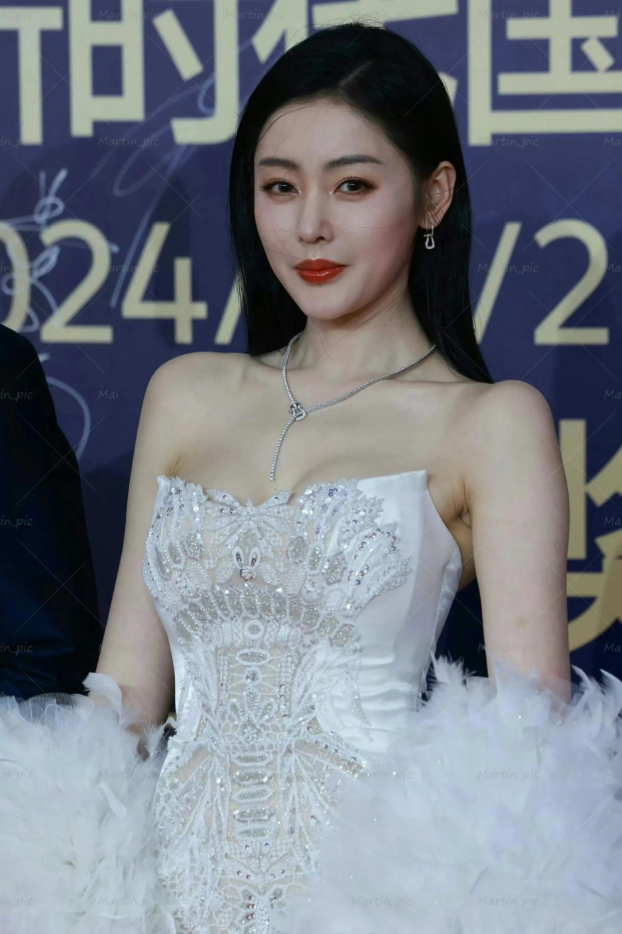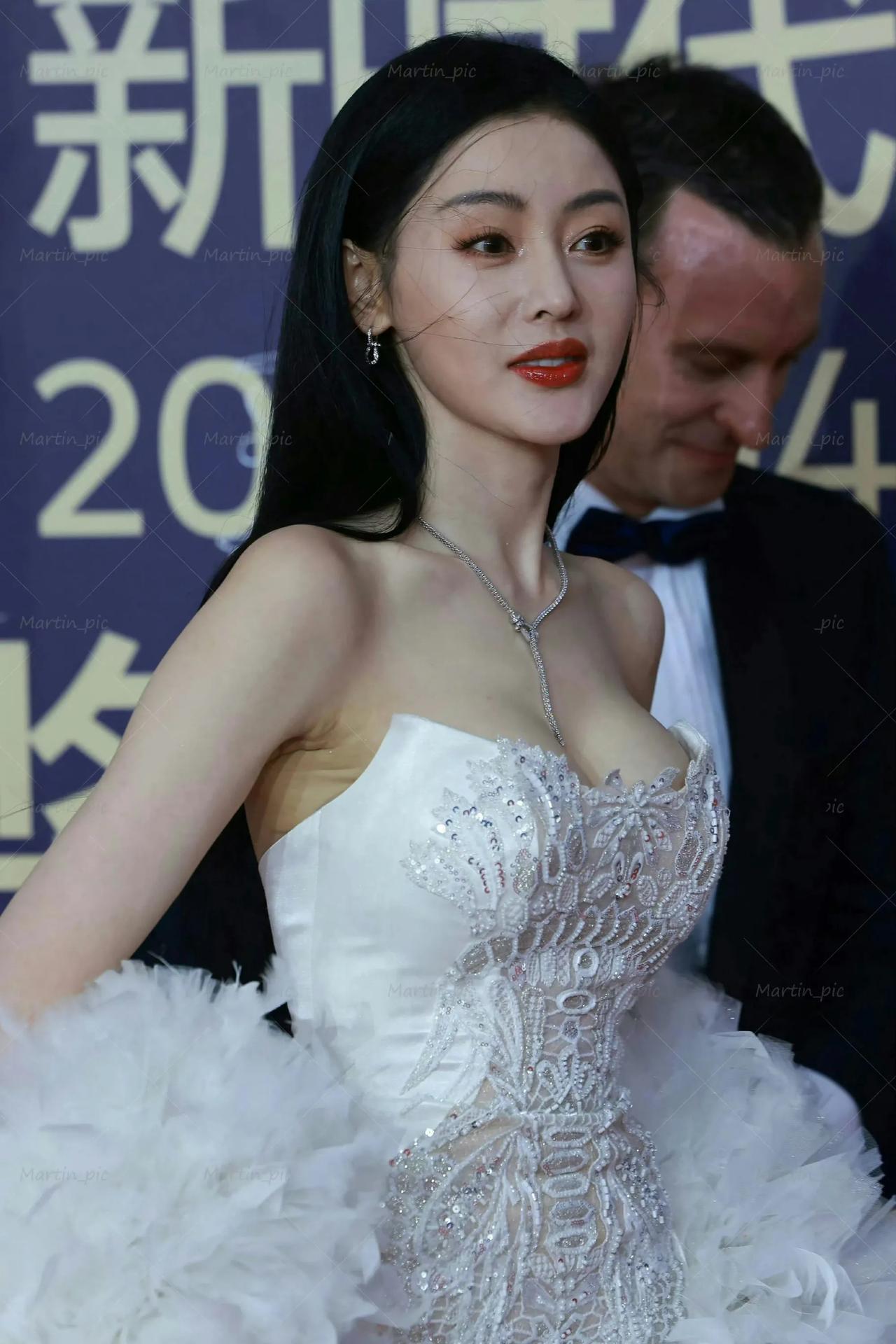 张天爱穿白色抹胸羽毛裙,皮肤透亮似发光,发丝轻扬、浅笑间,身材曲线把红毯都要“烫