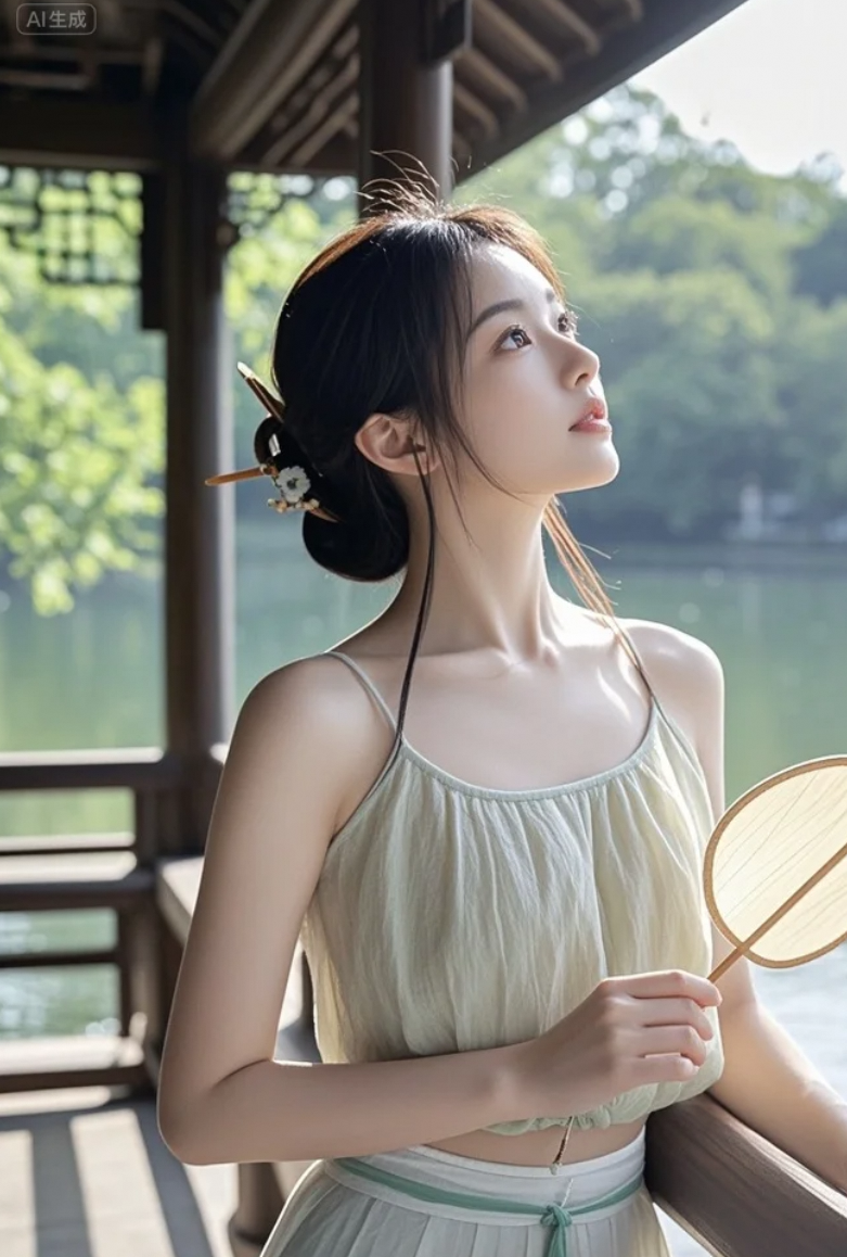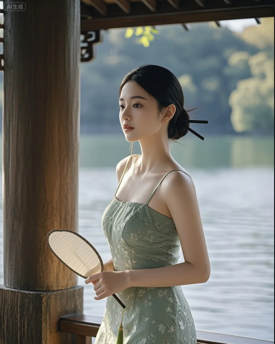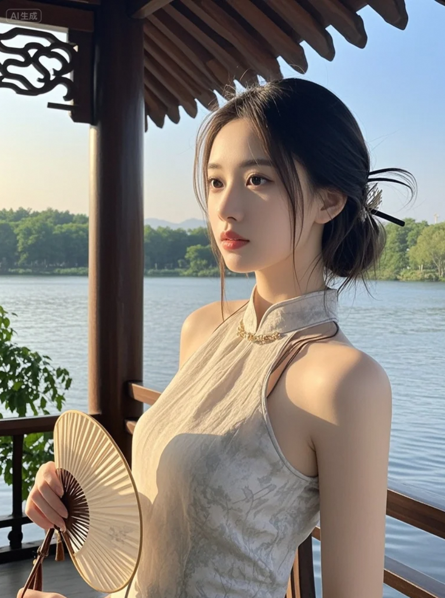 水墨江南佳人倚栏粉色温柔旗袍美女穿搭水墨江南