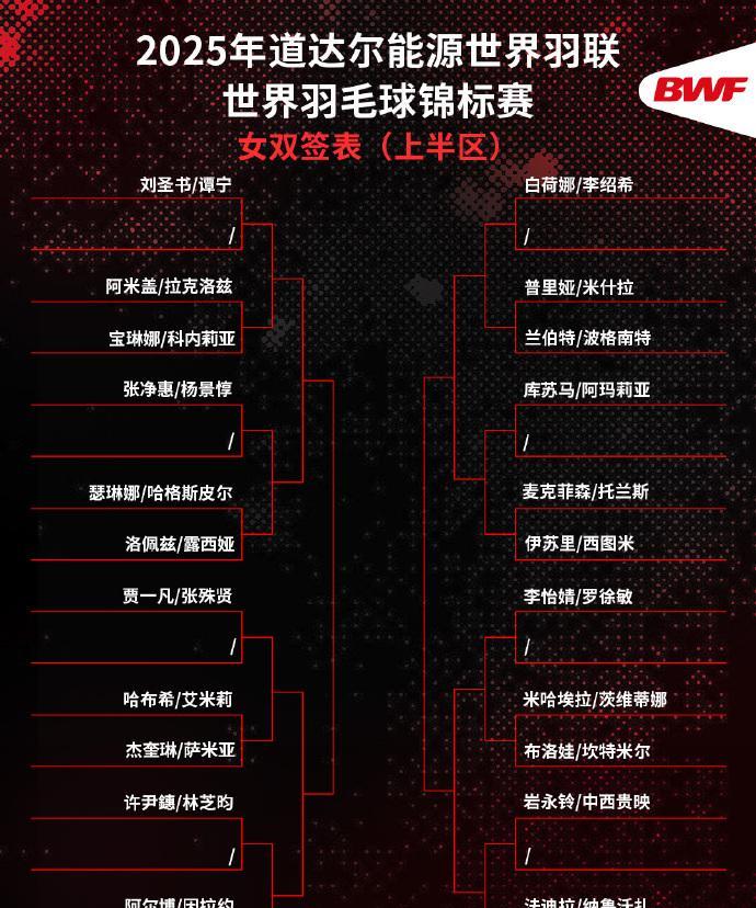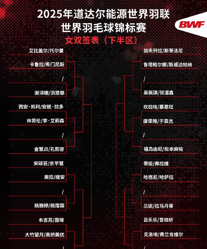 羽毛球世锦赛签表女双签表不佳。三大女双云集上半区,只能有一对进入决赛。刘圣书/谭宁、贾一凡/张殊贤、李怡婧/罗徐敏三对女双均在上半区,尽管三大女双首轮均轮空,但第四轮也就是进入前八后,刘圣书/谭宁将与贾一凡/张殊贤相遇,可惜了最近状态很好的贾一凡张姝贤了。李怡婧/罗徐敏第三轮的挑战来自于岩永玲/中西贵映,第四轮将面对上半区唯二有威胁的外协女双白荷娜/李绍希。唯一的安慰是下半区能打的不少,金慧贞/孔熙容、松山奈未/志田千阳、福岛由纪/松本麻佑、陈康乐/蒂娜只能有一对在决赛中遇到中国女双。