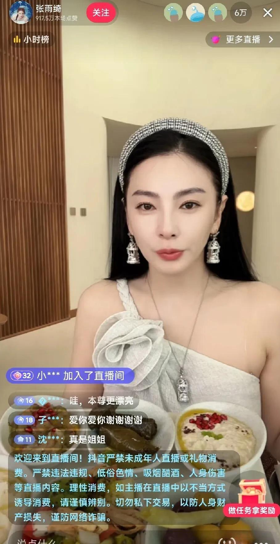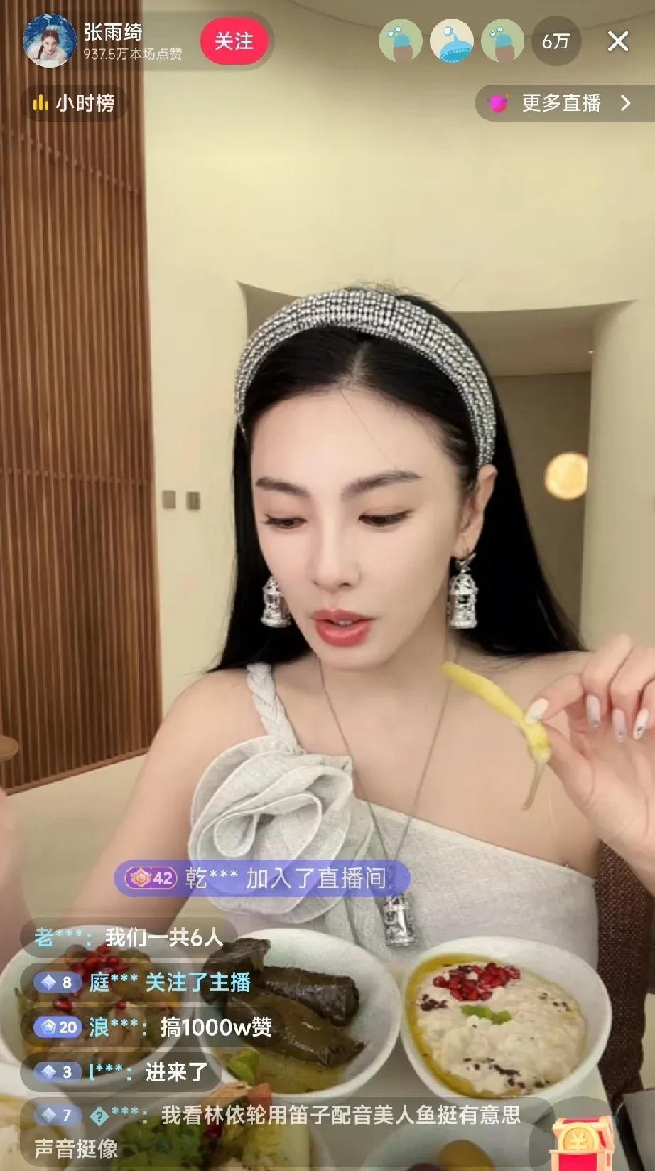 刚才刷到张雨绮在直播,点进去看了一会儿。好家伙,在线人数60000多人。张雨绮在那儿吃饭呢。挺简单挺健康的晚餐,就吃了很少的东西,助理就拿走了。当明星真不容易,吃口饭都得被管着。 张雨绮还是像年轻的时候一样,又美又飒,快人快语。 她和大家聊天,大声的笑。问大家想看衣服还是别的?就好像和朋友们聊天一样,不像有的主播,一个劲儿的嚷嚷着让下单啊、点赞啊、加关注、加群这些东西。 遇到那样的我会很烦,一下子划走。像张雨绮这种不怎么用套路的,我反而会留下来。 看着明媚、开朗,大气的张雨绮,就想,如果,当年她和汪小菲都成熟一点,是不是就不会分开,会不会生活的很幸福? 不过,人生没有假设,人生更不会重来。每个人都应该学会珍惜眼前人,珍视自己的幸福。