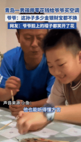 狠狠的羡慕住了!山东青岛,一老人因摔伤腿需要在家休养,可因天气炎热,家里又没空调,每天都热的不行,谁料孙子得知后,二话不说就掏空零花钱,给爷爷买了台空调,把老人感动的说:这孙子给多少金银财宝都不换,网友:有一种炫耀叫“孙子送我的”! 据海报新闻8月13日的报道,男孩经常和几个小伙伴,到商场卖家电的地方玩,无意间就看到了有卖空调的。 随后他就想到了自己的爷爷,因为前段时间摔伤腿,只好待在家里休养,可家里又没有装空调,在这么热的天,肯定是受不了的。 所以男孩就回到家里,和父母说想给爷爷家里添置一台空调,至于钱的话,则用自己攒的零花钱就行。 在见到孩子如此有孝心时,作为父母的肯定不会阻拦,等第二天,就和男孩一起去店里把空调给买下来了。 而当老人见到这一幕时,这心里又感动又甜滋滋的,能摊上个这样的孙子,这辈子已经知足了,甚至拿再多的金银珠宝,老人都不会去换的。 老话说百善孝为先,这位男孩年纪轻轻的,就能有如此孝心,实在是太难得了,换做其他的同龄人,估计绝对做不出这种事情。 别的先不说,就仅凭他的那份孝心,日后肯定能有一番大作为,成长的旅途都是顺利的,相信老天也绝对会善待如此懂事的孩子。 那么对于这件事情,您有什么看法呢?