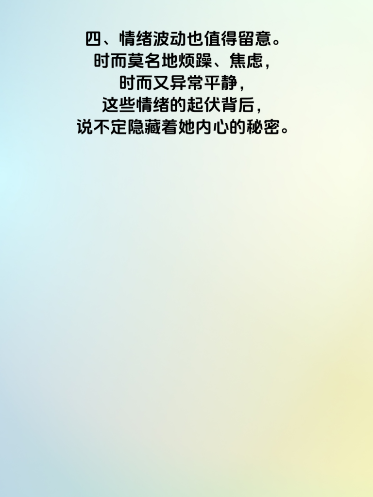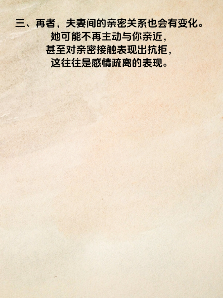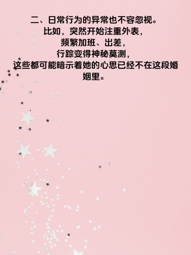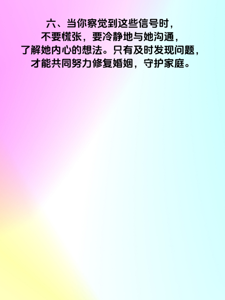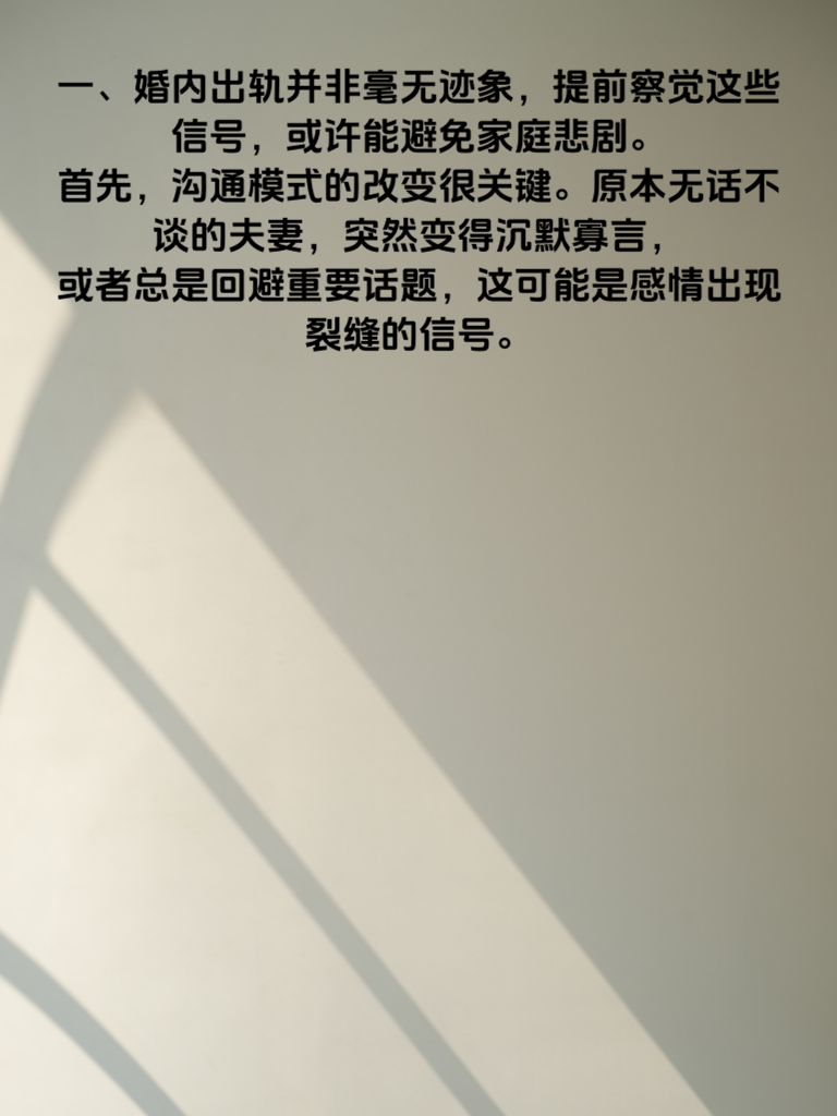 一、婚内出轨并非毫无迹象,提前察觉这些信号,或许能避免家庭悲剧。首先,沟通模式的改变很关键。原本无话不谈的夫妻,突然变得沉默寡言,或者总是回避重要话题,这可能是感情出现裂缝的信号。 二、日常行为的异常也不容忽视。比如,突然开始注重外表,频繁加班、出差,行踪变得神秘莫测,这些都可能暗示着她的心思已经不在这段婚姻里。 三、再者,夫妻间的亲密关系也会有变化。她可能不再主动与你亲近,甚至对亲密接触表现出抗拒,这往往是感情疏离的表现。 四、情绪波动也值得留意。时而莫名地烦躁、焦虑,时而又异常平静,这些情绪的起伏背后,说不定隐藏着她内心的秘密。 五、如果发现她开始偷偷使用新的社交软件,或者对手机格外小心,不愿让你触碰,那就要提高警惕了。 六、当你察觉到这些信号时,不要慌张,要冷静地与她沟通,了解她内心的想法。只有及时发现问题,才能共同努力修复婚姻,守护家庭。