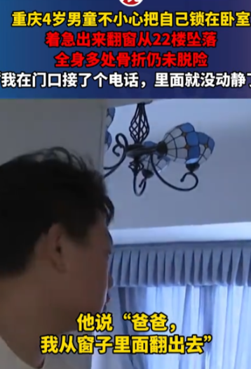 痛心!重庆4岁半男孩冉冉与1岁妹妹在客厅玩耍时跑进主卧,房门意外反锁。父母尝试开门近10分钟未果,冉冉隔着门喊:“爸爸,我从窗子翻出去就能出去了!”那可是22楼啊!