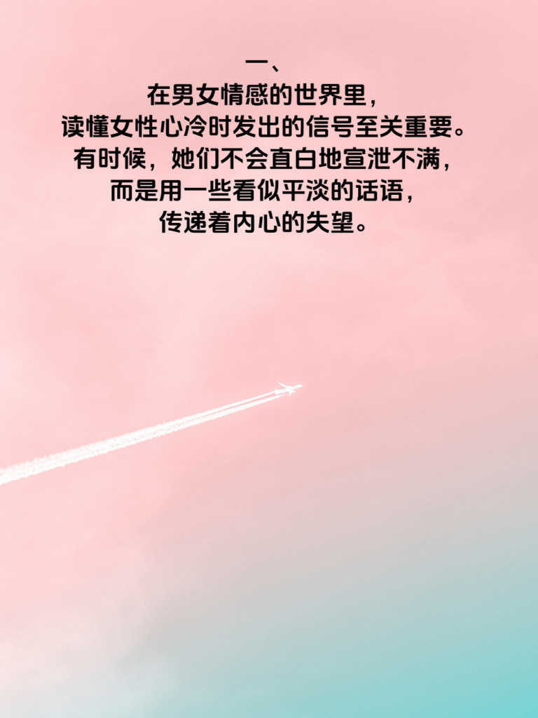 一、在男女情感的世界里,读懂女性心冷时发出的信号至关重要。有时候,她们不会直白地宣泄不满,而是用一些看似平淡的话语,传递着内心的失望。 二、其中一句常见的话是“随便你”。当她说出这三个字,往往意味着她对这件事已经失去了兴趣和参与的热情。她不再愿意为你的决定争论或发表意见,心或许已悄然转向冷漠。 三、“我没事”也是典型的信号。这并非真的没事,而是她不想再麻烦你,不想让你看到她脆弱的一面。她选择独自承受,心也在慢慢筑起防线。 四、还有“别管我”,这是她在拒绝你的关心。她可能觉得此刻的自己无法回应你的温暖,心在这一刻有些封闭。男生们若能敏锐捕捉这些信号,及时沟通、给予理解,或许就能避免情感走向冰点。