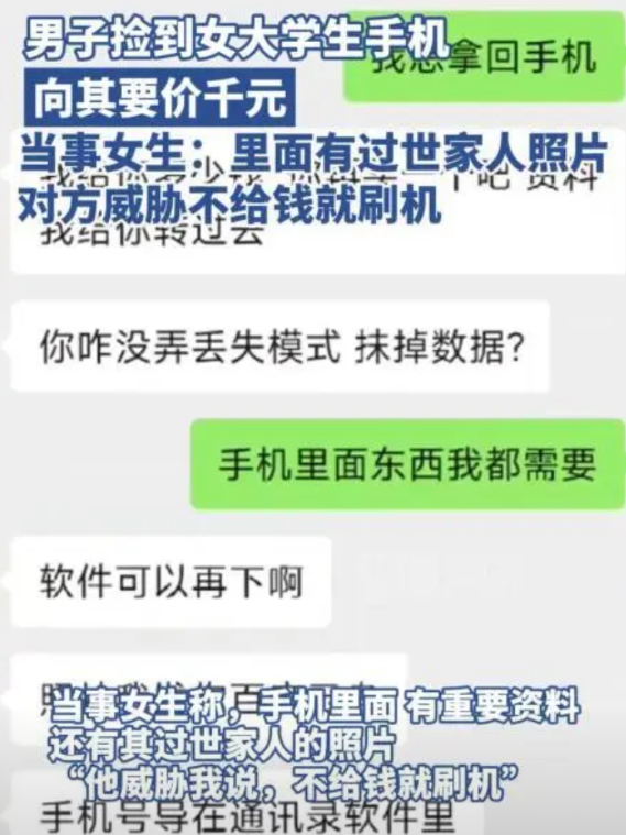 2023年11月份,在安徽合肥,有个叫小张的女大学生,在商场吃饭时不小心把手机弄丢了。她赶紧找了警察帮忙,后来警察帮她找到了拿手机的那个人。可是呢,那个人说要想拿回手机,得给他一笔不小的“辛苦费”。小张一听就愣了,她试着跟那个人商量,但对方一口咬定就要那么多钱,还吓唬她说:“不给钱我就把手机里的东西都删掉。”这事儿不光让小张心里不舒服,也让社会上很多人议论纷纷。