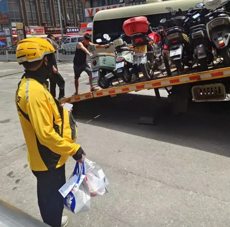 谁能理解外卖员的苦。这位外卖员刚从店里拿到外卖,来到大街上却发现自己的电驴已经被扣押,正在被城管往大卡车上搬呢。 外卖员不知所措,其实抓紧时间可以把电驴要回来的,他却无动于衷,可能是太失望了,而不知道怎么办了。 虽然大家都经常骂城管,可是不得不承认没有城管,城市道路上只会有更多道路被占,更多垃圾出来,城管做的一件大事就是清理违规电驴,可惜这位外卖师傅没赶上好时候,导致电驴被清走了。