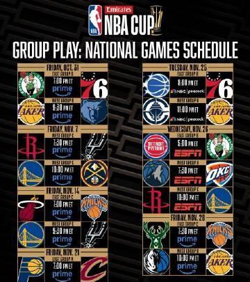 阿联酋航空NBA杯分组情况 西部A组 [明尼苏达森林狼队、俄克拉荷马城雷霆队、菲尼克斯太阳队、萨克拉门托国王队、犹他爵士队] 西部B组 [达拉斯独行侠队、洛杉矶快船队、洛杉矶湖人队、孟菲斯灰熊队、新奥尔良鹈鹕队] 西部C组 [丹佛掘金队、金州勇士队、休斯顿火箭队、波特兰开拓者队、圣安东尼奥马刺队] 东部A组 [亚特兰大老鹰队、克利夫兰骑士队、印第安纳步行者队、多伦多猛龙队、华盛顿奇才队] 东部B组 [波士顿凯尔特人队、布鲁克林篮网队、底特律活塞队、奥兰多魔术队、费城76人队] 东部C组 [夏洛特黄蜂队、芝加哥公牛队、迈阿密热火队、密尔沃基雄鹿队、纽约尼克斯队] 阿联酋航空NBA杯,小组赛:全国赛事赛程 10月31日(周五) 东部B组 上午7:00(太平洋时间) prime直播 (波士顿凯尔特人队对阵费城76人队) 西部B组 上午9:30(太平洋时间) prime直播 (洛杉矶湖人队对阵孟菲斯灰熊队) 11月7日(周五) 西部C组 晚上7:30(东部时间) prime直播 (休斯顿火箭队对阵圣安东尼奥马刺队) 西部C组 晚上10:00(太平洋时间) prime直播 (金州勇士队对阵丹佛掘金队) 11月14日(周五) 东部C组 上午7:00(太平洋时间) prime直播 (迈阿密热火队对阵纽约尼克斯队) 西部C组 上午9:30(太平洋时间) prime直播 (金州勇士队对阵圣安东尼奥马刺队) 11月21日(周五) 东部A组 上午7:00(太平洋时间) prime直播 (印第安纳步行者队对阵克利夫兰骑士队) 西部C组 上午9:30(太平洋时间) prime直播 (丹佛掘金队对阵休斯顿火箭队) 11月25日(周二) 东部B组 上午8:00(太平洋时间) NBC/孔雀流媒体直播 (奥兰多魔术队对阵费城76人队) 西部B组 晚上11:00(东部时间) NBC/孔雀流媒体直播 (达拉斯独行侠队对阵洛杉矶湖人队) 11月26日(周三) 东部B组 下午5:00(太平洋时间) ESPN直播 (底特律活塞队对阵波士顿凯尔特人队) 西部A组 晚上7:30(东部时间) ESPN直播 (明尼苏达森林狼队对阵俄克拉荷马城雷霆队) 西部C组 晚上10:00(东部时间) ESPN直播 (休斯顿火箭队对阵金州勇士队) 11月28日(周五) 东部C组 晚上7:30(太平洋时间) prime直播 (密尔沃基雄鹿队对阵纽约尼克斯队) 西部B组 晚上10:00(太平洋时间) prime直播 (达拉斯独行侠队对阵洛杉矶湖人队) 赛事将从10月31日到11月28日进行小组赛,半决赛和决赛将于12月13日和16日在拉斯维加斯举行!