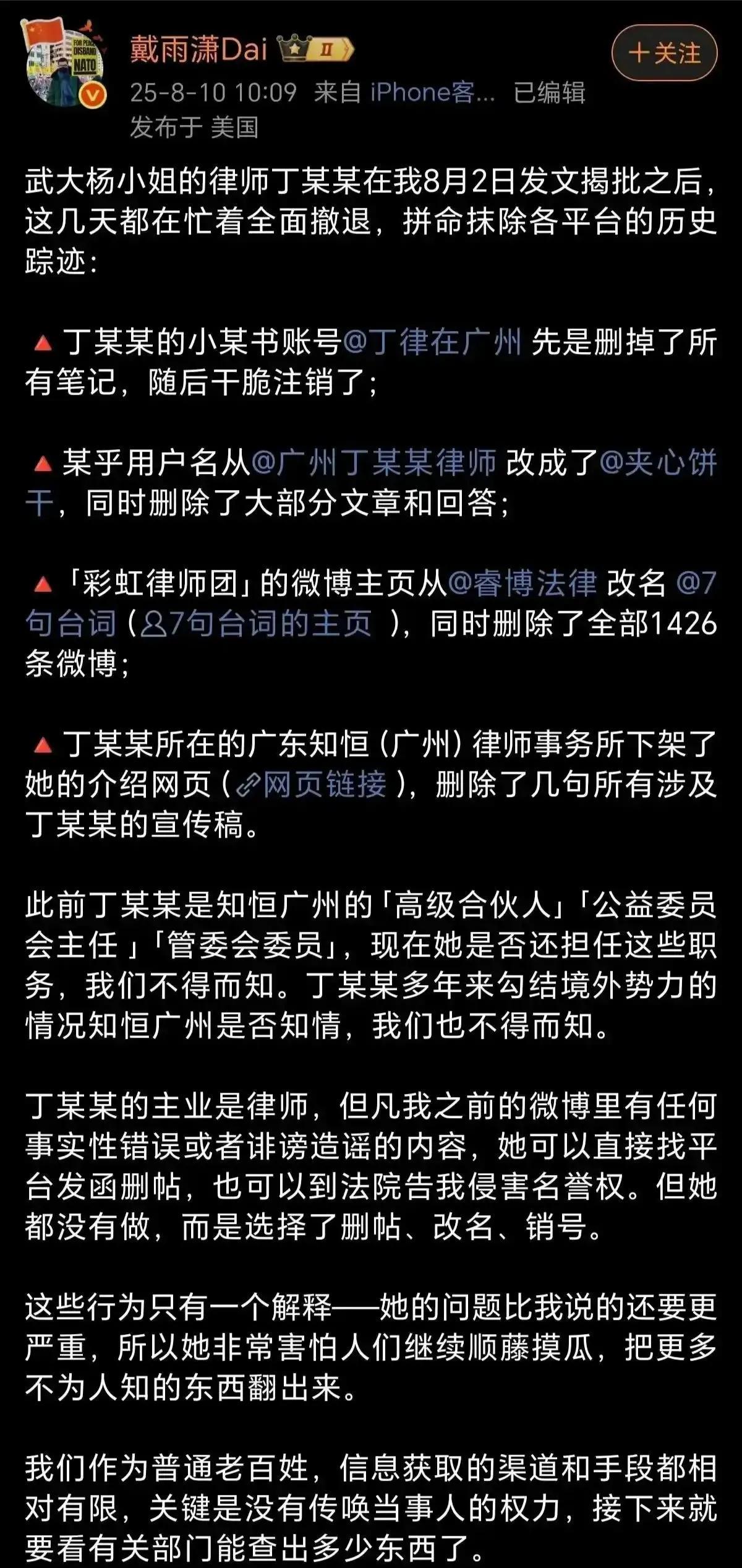 刘辅导员也没想到杨某狗急跳墙甩出录音,屁股坐歪严重,人设崩塌。杨某的律师丁某拼命抹除各平台的踪迹,疑似销号跑路。 自从法院判决肖某性骚扰不成立,舆论对杨某不利,眼看要完了,杨某曝出了与肖某辅导员的录音,将脏水往刘辅导员身上泼,将自己的罪过化小。 作为武大14年标兵的刘辅导员,不为自己的学生肖某主持公道,却一开始屁股就坐歪,多次附和杨某的诉求,透露事件重要信息,为杨某诬陷肖某事件添了一把火。 刘辅导员说,她觉得杨某提的诉求和处理,对肖某很轻了,作为女性,他其实是很站在杨某这一边的。对于杨某提出的对肖某不能保研等诉求,刘辅导员告诉她,其实学校规定里没有这几条,但一旦肖某有了处分,肯定会被取消这些。 刘辅导员说的每一句话似乎都是在附和杨某,都是屁股坐歪的表现,她不像是站在学校的立场中立调解,更像是个好闺蜜在帮助出主意,透露学校内部处理流程和态度,以及肖某的家庭信息。 录音一公开,刘辅导员人设崩塌,刚晋升的她调离了岗位。 听了录音,估计有的人后背发凉,杨某手中到底有多少人的录音?参与该事调解和处理的人,是不是也像刘辅导员一样,才助长了杨某的不可理喻的嚣张气焰。 因为杨某,大家对她的律师丁某进行一步步深挖,信息量不少。杨某在憋损招,丁某忙着全面撤退,拼命抹除各平台历史踪迹,疑似销号跑路。 杨某当初找丁律师的时候,八成是录了音的,丁律师肯定给杨某出过不少主意,提了不少专业建议,说不定比辅导员那招更狠。 四川张薇案,成都地铁案,史航案,这个律师都有参与,他所在的团队叫彩虹律师团,据说背后有组织,杨某如果公开她与丁律师的录音,大量的信息就会得到佐证,能不怕? 处处录音,阴险可怕,一件没根据的小事在杨某的操作下失控。武大已无所适从,两手一摊“听上级安排”,再无下文。 武大,与其在沉默中声誉尽毁,不如在沉默中亮出锋芒。