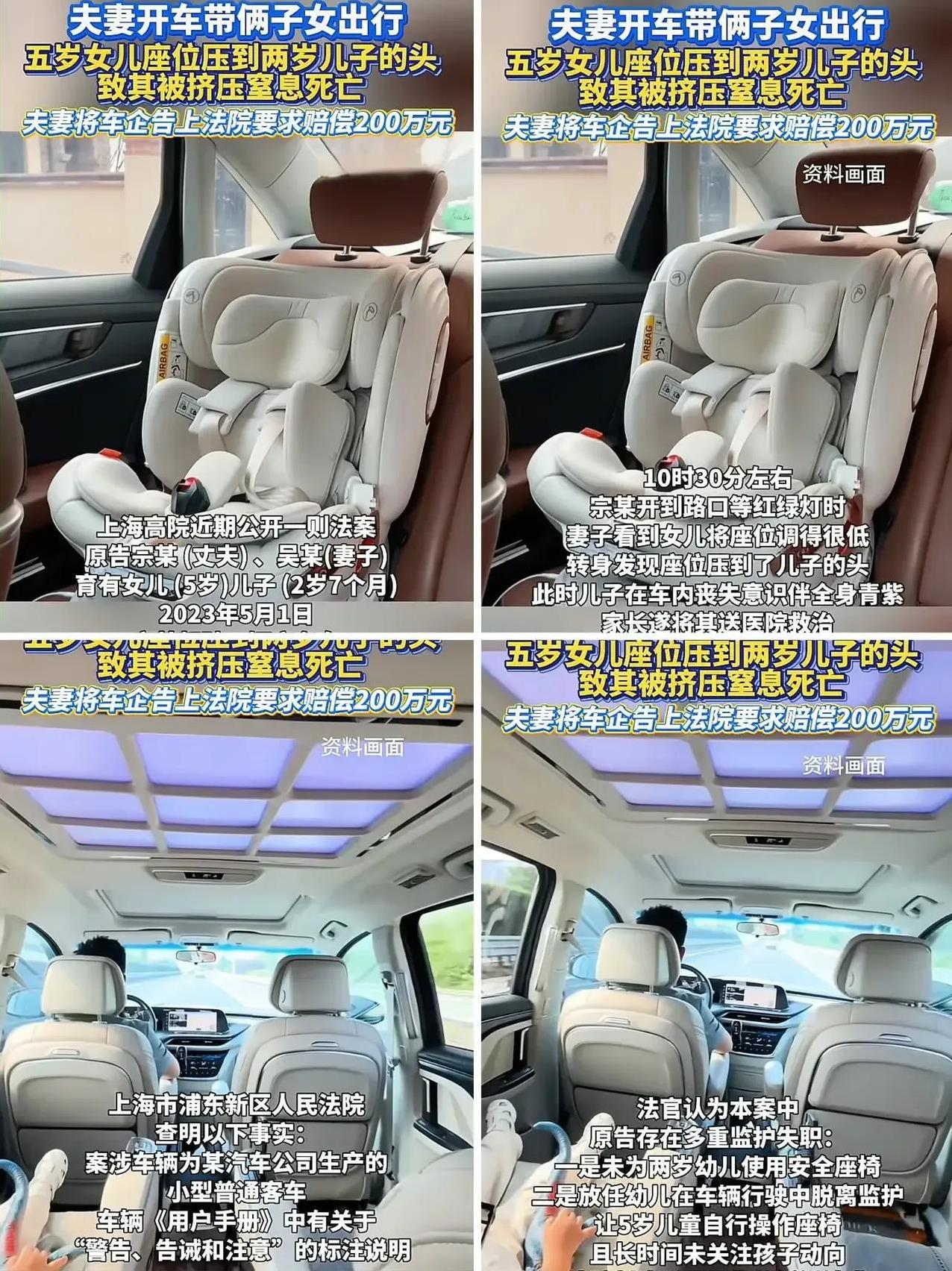 看到一则既心痛又气愤的消息! 一对夫妇开丰田商务车带一双儿女出门,老公开车,老婆和5岁的女儿坐第二排,2岁7个月大的儿子一个人坐第三排。 在经过一个十字路口等红灯的时候,妻子回头看了儿子一眼,顿时觉得天塌了,只见女儿把她自己的座椅调的很低,恰好把儿子死死的压在了座位上,儿子一动不动。 夫妻俩人把孩子送到医院,被判窒息而亡。 过后,夫妻把车企告上了法庭,要车企赔偿200万。 这对夫妻失去儿子的绝望和痛苦是真的让人同情的,可这一切不都是他们不负责任造成的吗? 儿童要坐儿童座椅是明文规定的,就算不坐,那也应该妻子带着2岁7个月的小孩坐在一起呀,这样才能更好地看管孩子,怎么能让这么幼小的孩子一个人坐在后面。 再说,坐在后面,作为大人不应该一只眼睛时刻关注着孩子吗? 只能说这对夫妻完全没有安全意识,也没有责任心,更滑稽的是,居然还要车企赔钱,这脑子伤心坏了?跟车企有什么关系,位置高度是你们自己调的,又不是汽车失灵自己调的。 这是想甩责任并趁势拿上一笔,太蠢! 大人没有起到监护的责任怪谁呀?2岁的孩子坐后面玩手机,妈妈怎么想的?爸爸开车可以理解,当妈的不坐在后面吗?,上小学前的孩子就不能离开大人的视线。