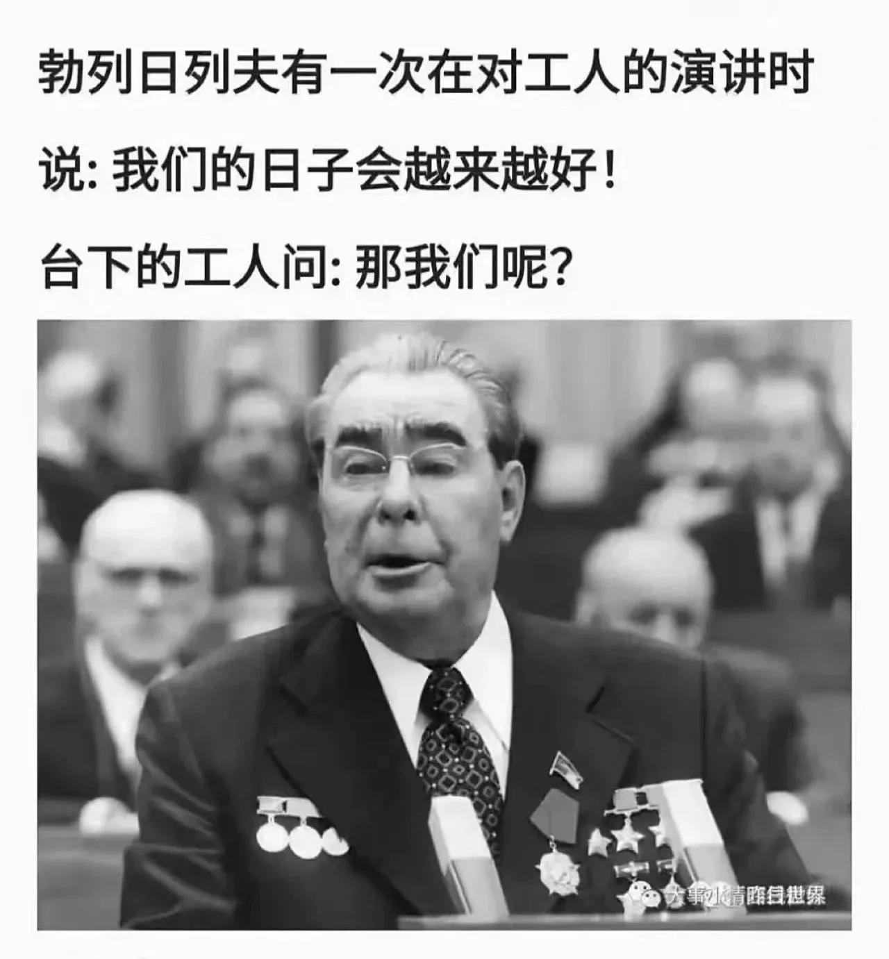 勃列日涅夫的"我们"≠工人师傅们的"我们"? 一次大会,勃列日涅夫对台下的工人们讲:我们的生活会越来越好! 工人们问:那我们呢? ……