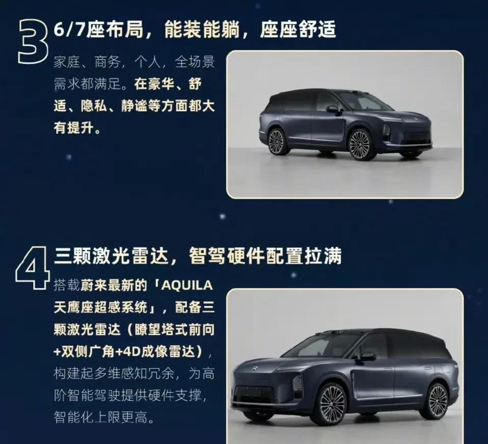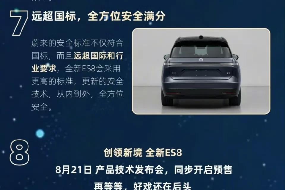 总结了蔚来ES8现有的所有准确情报。 1.三排座6座和7座布局。 2.首创 900V 超充,快速换平电台。 3.蔚来全新 ES8在8月21日 19:30 技术发布会,同时开启预售。 4.同级最长车身。 5.配置三颗激光雷达(瞭望塔式前向 + 两侧广角+4D成像雷达)。 6.五分钟闪充续航超250km。 7.标配100kW快充。 #我的汽车生活日记#