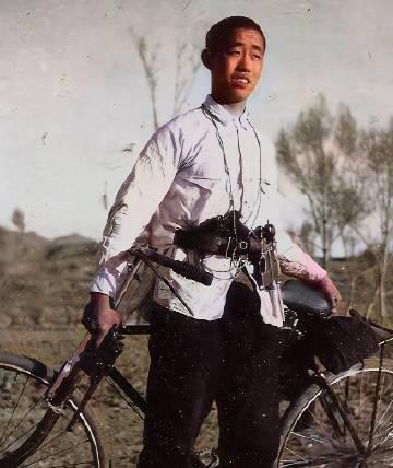 1944年夏,晋察冀根据地。武工队副连长王树平,站在一辆自行车前。他腰间别着驳壳