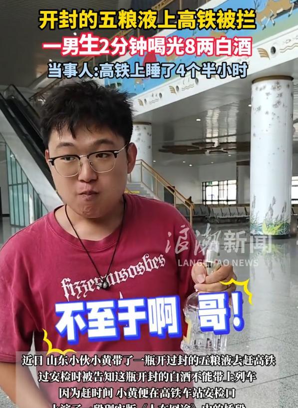 小伙是个狠人!江苏盐城,一小伙参加完聚会准备坐高铁回家,不料,在车站过安检时,开封的五粮液无法带到车上,小伙直接对着瓶嘴喝了起来,仅仅用时2分钟,就喝光8两白酒 小伙介绍,自己今年23岁,是一名在校研究生,当天本来是去参加朋友聚会的,吃完饭后发现有一瓶五粮液打开后没喝完,想着扔了太浪费,就直接放到包里,准备带回家接着喝 没成想,在高铁站过安检时,因为瓶子已经开封,被工作人员拦住无法带上车,可火车又快开车了,再去寄快递已经来不及了,于是直接拎瓶喝了起来 一开始喝着还没什么感觉,可越喝越上头,就连一旁的工作人员和朋友都劝阻,但小伙还是分几口,把一瓶酒全都喝了下去,结果就是上车后就开始晕了,直接睡了4个多小时 有网友表示:为什么开封了就不能带进去,参照高铁带水,开封了尝一口就能过 其实规定很明确,50度以上白酒最多带两瓶,还必须原包装未开封。主要是担心易燃液体引发安全隐患。就像飞机上不能带打火机,不是航空公司故意为难人 不过这个事倒也给不少人一个提醒,聚会剩下的酒如果打算带走,最好是原封未开,或者干脆提前打包进小瓶,省得在车站为难自己 #带五粮液上高铁被拦 男子当场喝光#