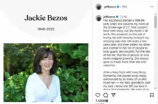 贝佐斯的亲妈去世了,距离儿子风光的威尼斯婚礼这才刚俩月,老太太78岁,唉,只能说再有钱的人在病痛面前有时也是无力回天的。但这老太太一辈子真值,儿子有名,后嫁的这个老公又爱她,仨孩子都孝顺,老太太自己的长相也是那种温润型的,一看就是好脾气的女人。 都说好女人旺三代,感觉贝佐斯老妈看着就是那种贤妻良母型,怪不得她的第二任老公、也就是大富豪贝佐斯的养父对她们母子俩这么好呢。老头老太太退休后还拿出了自己的积蓄,扶持了刚创业时的贝佐斯,可见老太太连同贝佐斯的养父都是有眼光的、也是很爱这个儿子的。 就像贝佐斯刚刚声明里说的,老太太去世时,老公、儿子、孙子都在她身边,老太太一辈子能这样过,真的已是人中龙凤。 就是不知道她生前是怎么评价儿媳妇的,毕竟儿子娶了有仨孩子的桑切斯,一般婆婆可能心里都不太乐意的吧。