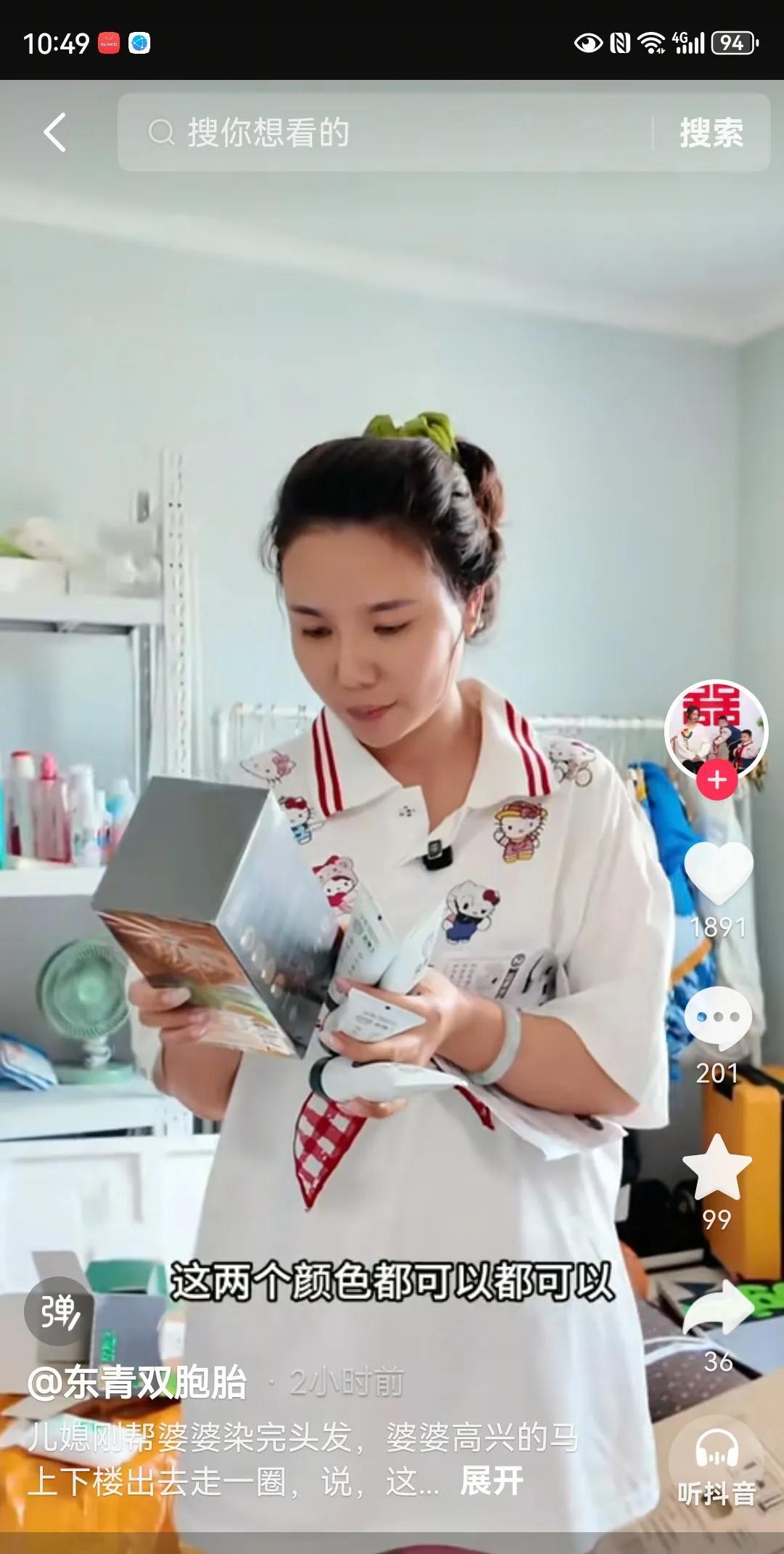 二姐这集从头到尾的广告。 二姐一家马上要搬去苏州,婆婆也要回老家带大孙子在老家上学,说着就要各奔东西。老婆婆的头发操劳得全白了,二姐今天安排一集视频给老婆婆染发,实话说,没看完,要有多无聊才能陪着她表演着把头发染完。 按惯例,评论区一堆留言说她老婆婆的头发好看了,变年轻了,然后一堆的粉丝要她染发膏的链接。其实,现在染发膏到处都有卖,手机里一扒拉弹出一堆的链接。说白了,都是写化学成分做成了,为了美,一年可以搞两次,换个发型换个心情。如果为健康考虑,还是少用那些,毕竟美跟健康比起来还是微不足道,自行甄别吧!