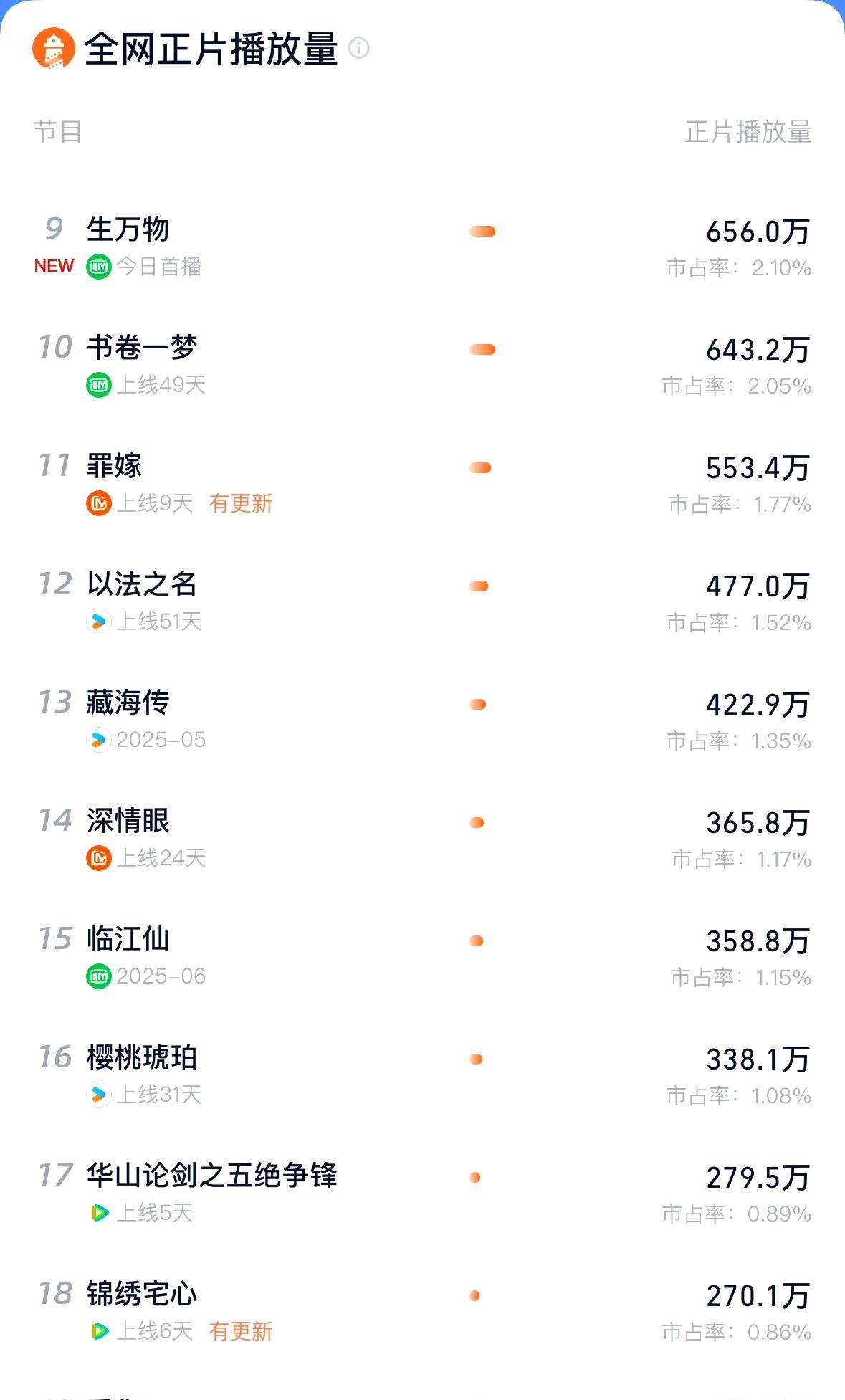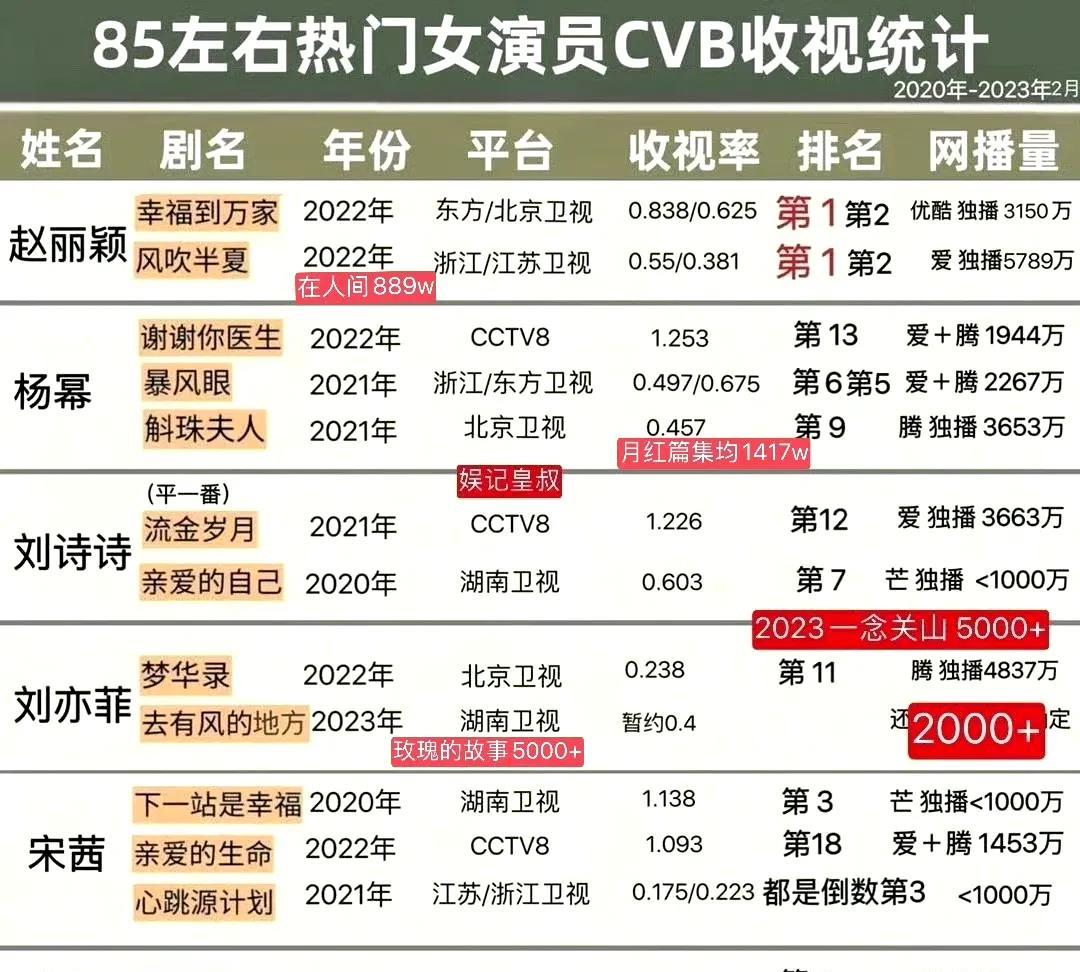 85花总能播一部剧立马回血 刘诗诗 生完孩子复出与倪妮合作的《流金岁月》云合集均3663w +搭档刘宇宁出演《一念关山》5000w成功回血。 唐嫣 《繁花》、赵丽颖《风吹半夏》、刘亦菲《玫瑰的故事》都是云合集均5000w+,而杨幂确确实实已经5年以上没有交出网播成绩亮眼的作品。都在说杨幂的《生万物》播的好,可是首播灯塔市占率2%+开局656w+集均130w。这个成绩可以说是开局就不如预期,而且很多观众都在说听不清杨幂的台词……