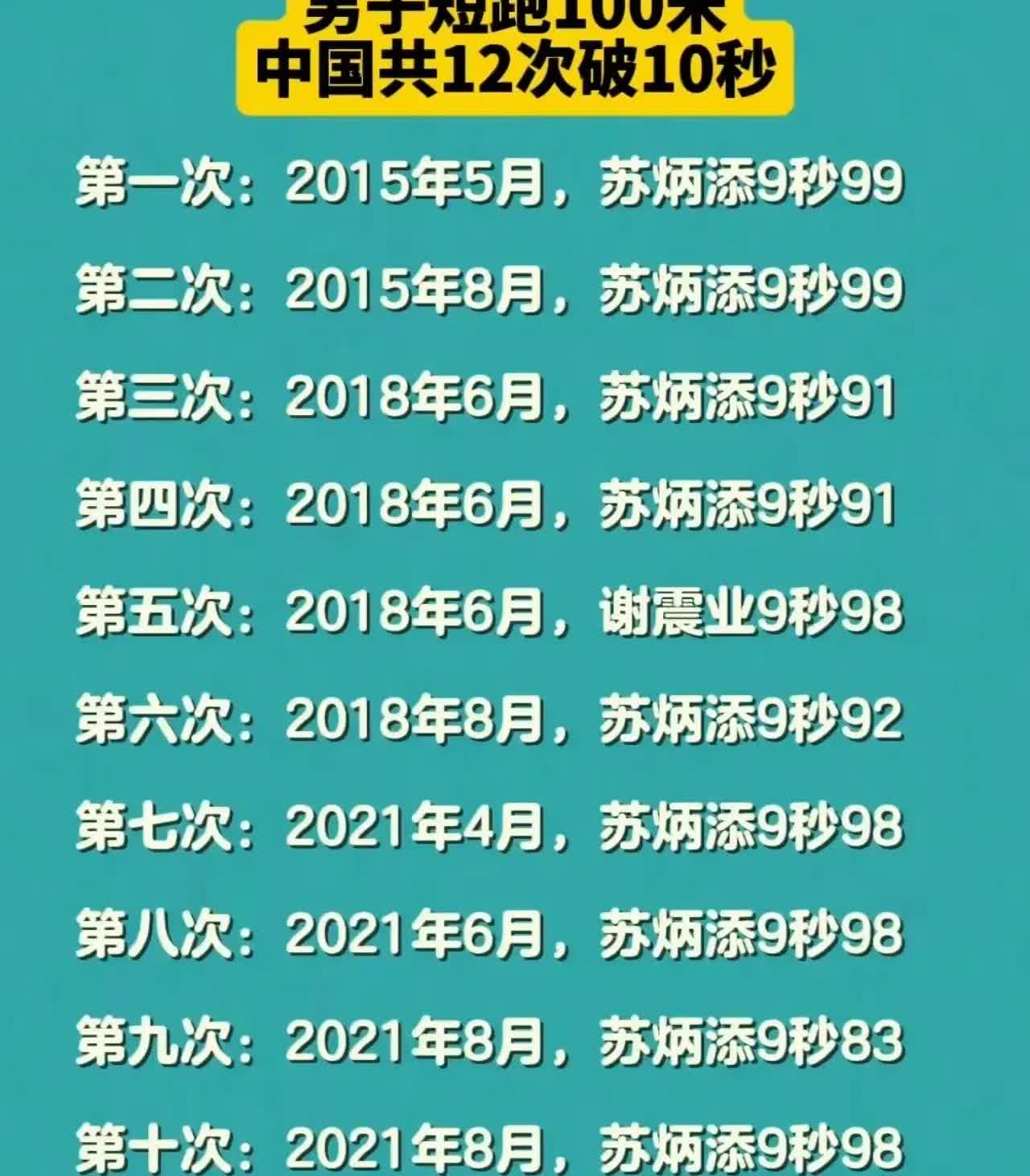 为什么说苏炳添是中国短跑史上最伟大的运动员。 男子短跑100米,中国共有12次跟进10秒大关,而苏炳添一人就占了10次! 更是跑到过9秒83的亚洲最好成绩,是真正意义上的田径第一人!