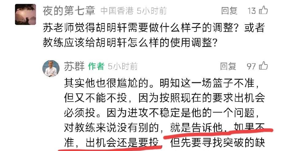 篮球名嘴苏群点名胡明轩:投不准突不进时,球不要粘在手里;恕我直言,胡明轩徐杰的快速陨落,也让球迷很好奇究竟是什么原因,特别是轩轩他在场上,一向是老持深重的苏群都看不过去说两句:投篮不准先突破,球不要在手里停!对半决赛打新西兰,苏群给出自己预测,45%概率击败新西兰。我认为,胡明轩打韩国那个关键失误,被面断+犯规+送对手罚篮,让我想起打菲律宾,也是最后胡明轩失误+违体,客场打日本最后时刻落后3分,他也送失误,不只是一两次了