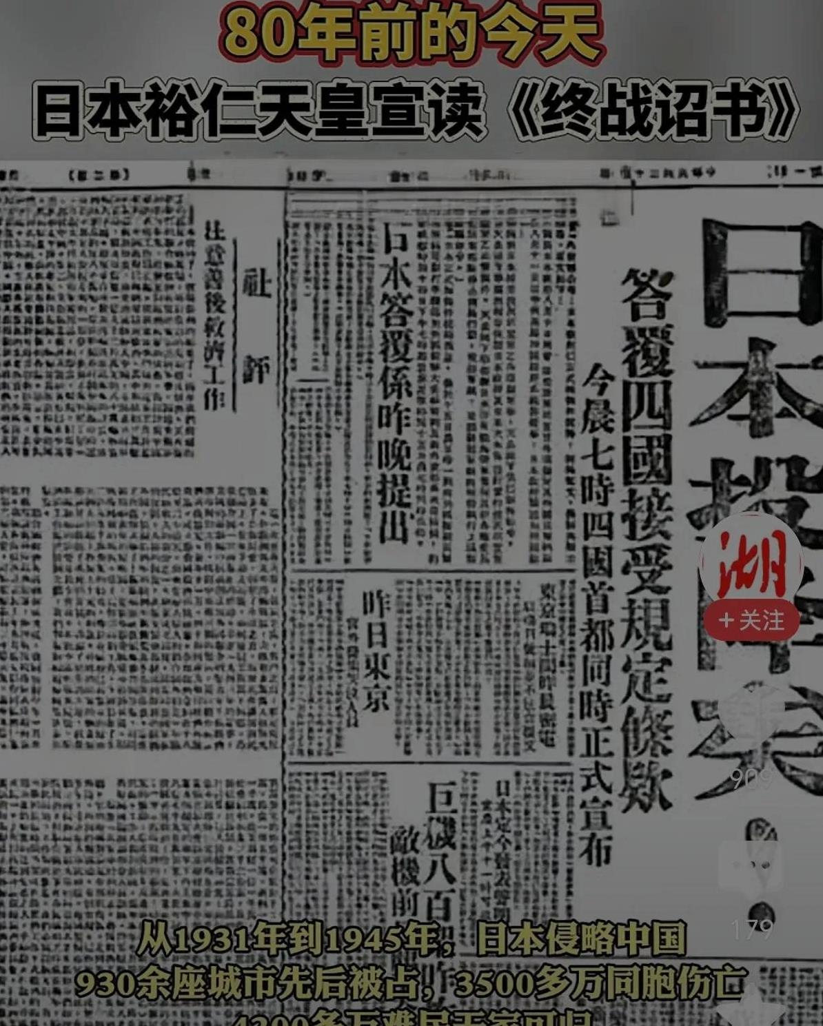铭记历史,勿忘国耻,吾辈当自强…… 80年前的今日,是中国人民永生难忘的日子。这一天,小日本毕恭毕地宣布无条件投降了,无数革命先烈历经14年的浴血奋战,最终迎来了中国抗击外敌入侵的完全胜利…… 中华民族永远不会忘却历史的耻辱,永远要奋发图强,热爱祖国,热爱人民。幸福生活得来不易,谨以此文献给在抗日战争以及解放战争中献出宝贵生命、作出不懈努力的伟大而不平凡的人们。如今的太平盛世来之不易,要理解国家,莫对祖国有怨言,中华人民共和国万岁!