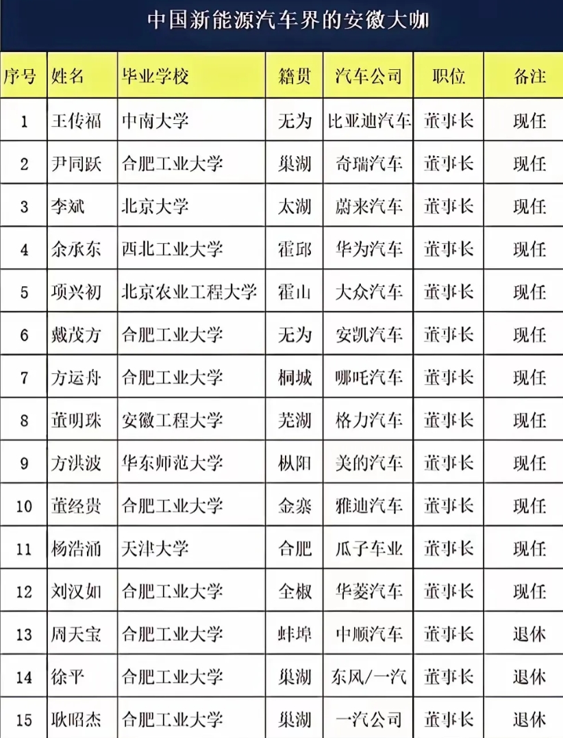 安徽造车第一并不是安徽汽车厉害,而是安徽人厉害。安徽当总部的只有奇瑞、蔚来、江淮、安凯四个品牌。但是安徽造车人却领导全国。出口第一的尹同跃,销量第一的王传福,智驾第一的余承东,两轮车第一的董经贵等等,这些大佬在外面造车都不会忘了安徽,比亚迪在合肥大手笔,制造中心,研发中心都有。余承东五界给安徽两界:智界+尊界。其他的还有很多就不一一说明了。