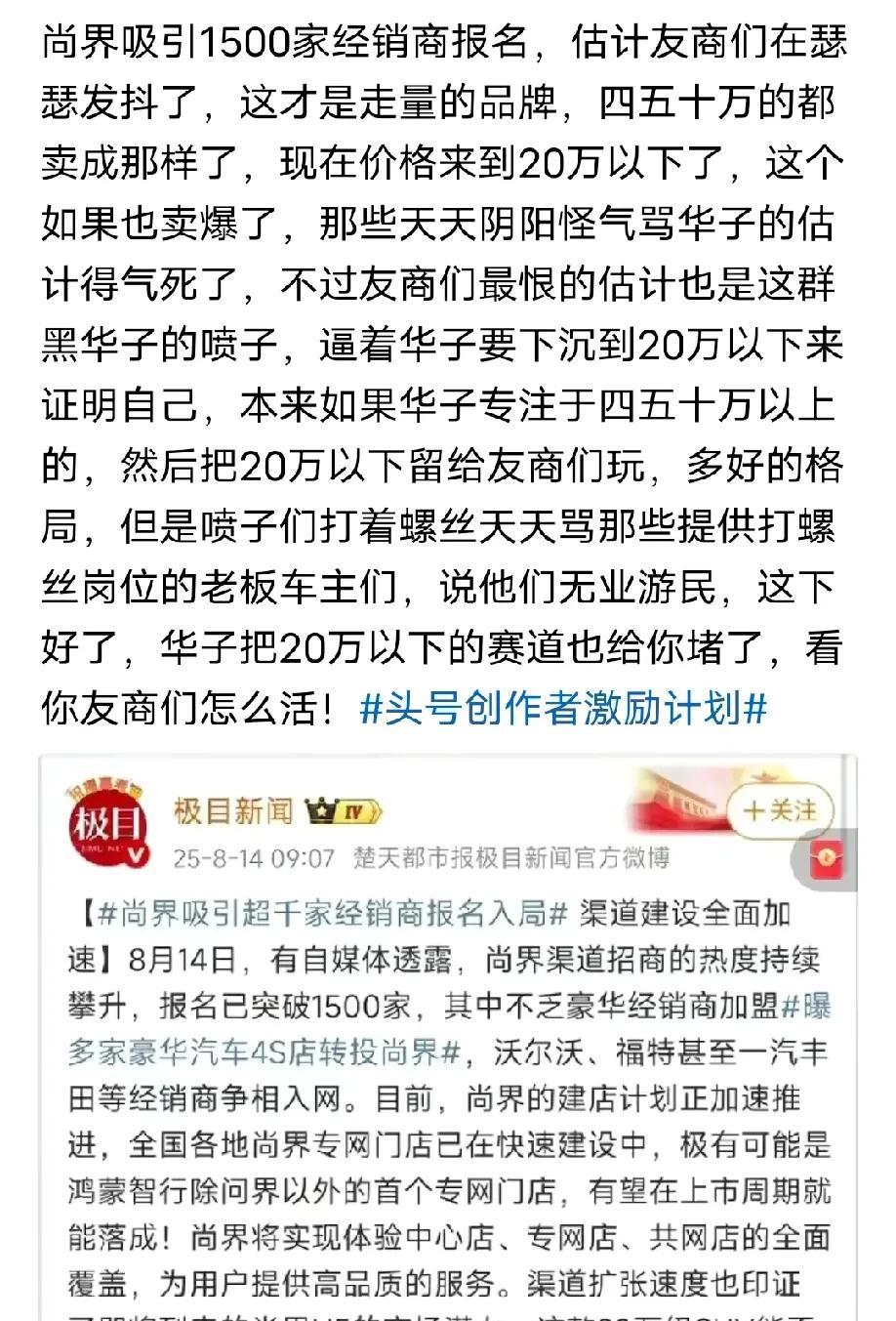 尚界这个盛况迟到了好几年,如果不是当初那11头猪投票投了11:0的话,估计尚界这个盛况早就已经出面了,11:0真的会载入史册,让广州掉出全国前四,而且这个差距会来越大,当初那些嫌弃华子越狠的车企,现在混得越差,当初那些越相信华子,越配合华子的车企,现在晚上睡觉都会笑醒!所以选择大于努力,往往一个企业成败就在一刹那,11:0就是最好的证明,这个案例会被当成反面教材在各大商学院反复强调,而且这个11:0不仅害了企业自己,还一定程度上拖慢了中国新能源车格局的形成,如果当初没有11:0,可能尚界这种盛况早两年就发生了!