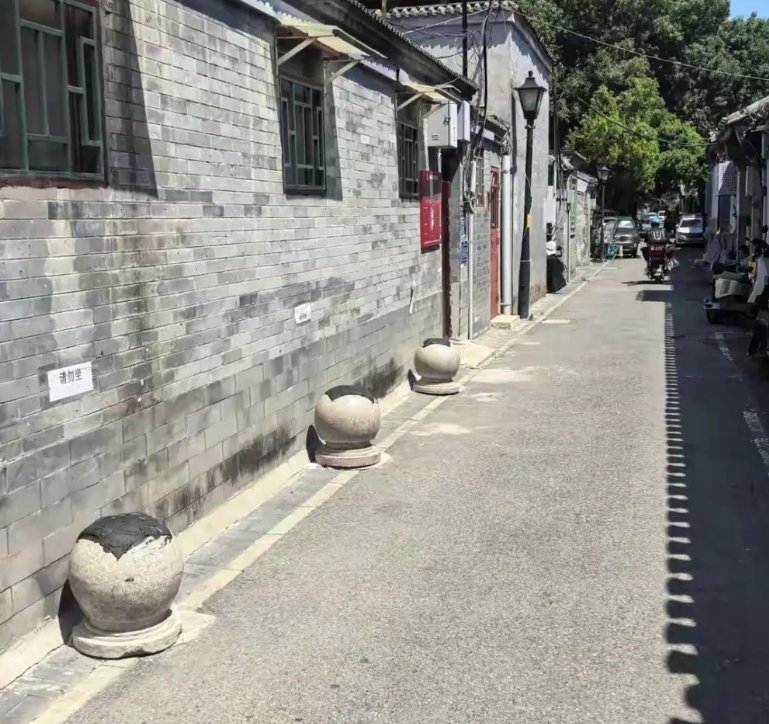 胡同里的一户人家,在自己家的墙外面放置了几个石球,不知道是这为了防止有人乱停车,还是担心有人在胡同里开车把墙给撞了,但是有些路过的人觉得累了,都会坐在石球上休息一下。
