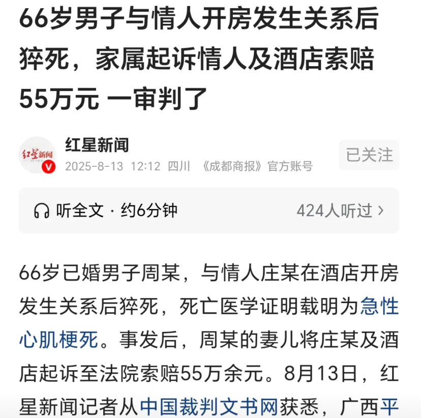 据红星新闻8月13日报道,66岁男子与情人开房发生关系后猝死,家属起诉情人及酒店索赔55万。