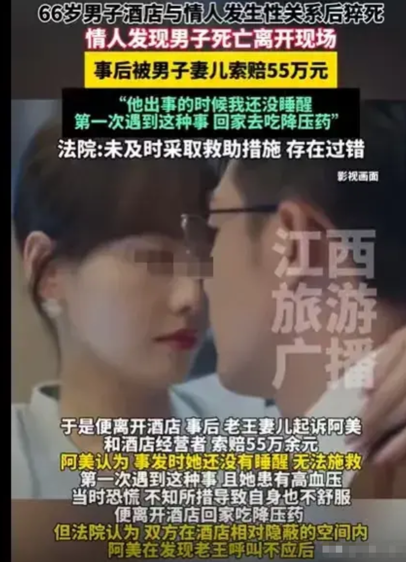 广西,66岁男子,带着69岁的情人开了房,他们俩发生了关系后,等女子醒来,发现男子没有了呼吸,大腿上还有黑点,她觉得男子已经不行了,她非常恐慌,赶紧回家吃了药,这才返回来,和工作人员去查看情况,可一切为时已晚,男子已经失去了生命,男子的妻儿,便要求酒店和女子赔偿55万余元。