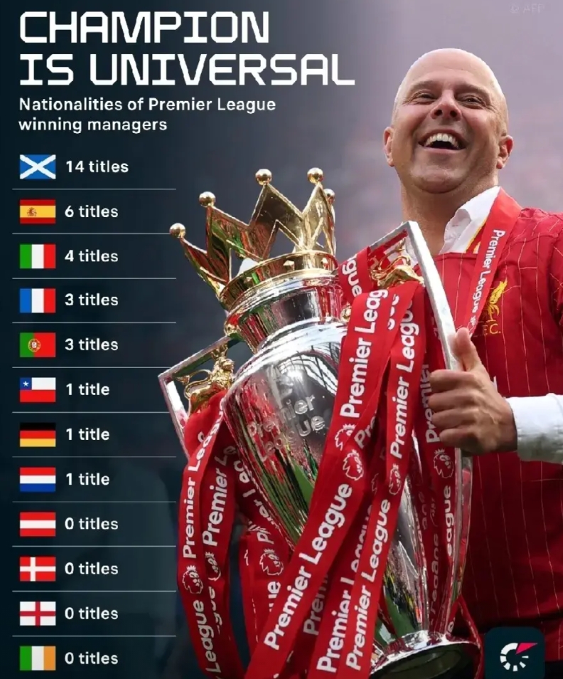 【这一定是英超联赛最大的耻辱】英超联赛自从诞生起已经产生了33个冠军,而盘点这33个冠军的带队主教练我们发现竟然没有一个来自英格兰!也就是说本土教练从未带领俱乐部夺得过英超联赛冠军,真的是奇耻大辱!这恐怕也是为何英超被称为第一联赛但是英格兰却从来没有大赛冠军的重要原因之一! 带队冠军最多的是来自于苏格兰(其实就是弗格森),排名第二的是西班牙(瓜迪奥拉),然后是意大利,其次是法国和葡萄牙,最后是智利、德国和荷兰。