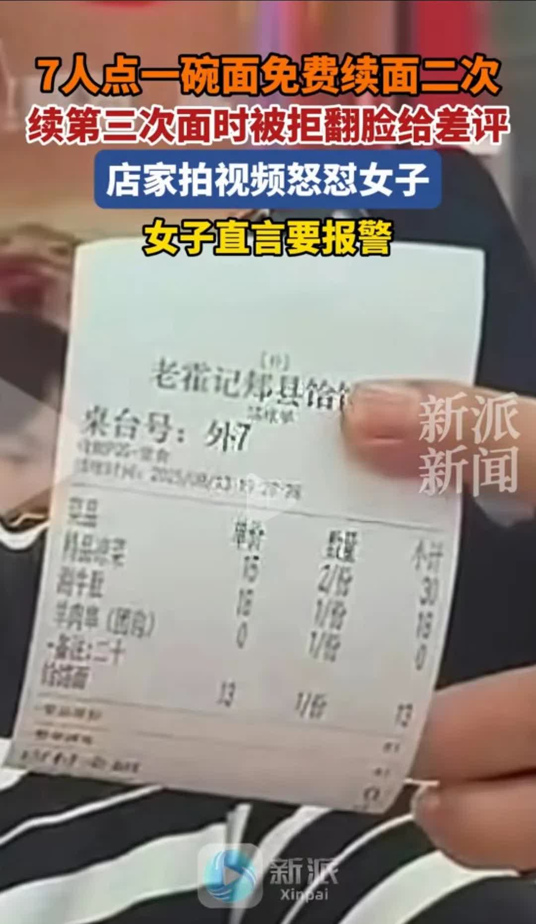 7个人吃一碗面!真相可能不是大家想的那样,首先女子确实是加了2次面,但你看看手里的堂食单子,还有2份凉菜,一份毛肚,花了61块钱,也不算少。。 其实老板生气的主要原因不是加面,而是女子当场给了差评,才气不过想要个说法。 这件事本来有更好的解决方案,老板可以建议女子加一点钱,自己给一些优惠再上一碗素面,成本不高,女子和孩子也能吃饱,双方都能接受。。 毕竟做生意遇到啥人都有,和气生财嘛,让她占点便宜算了[抓狂][抓狂]。。
