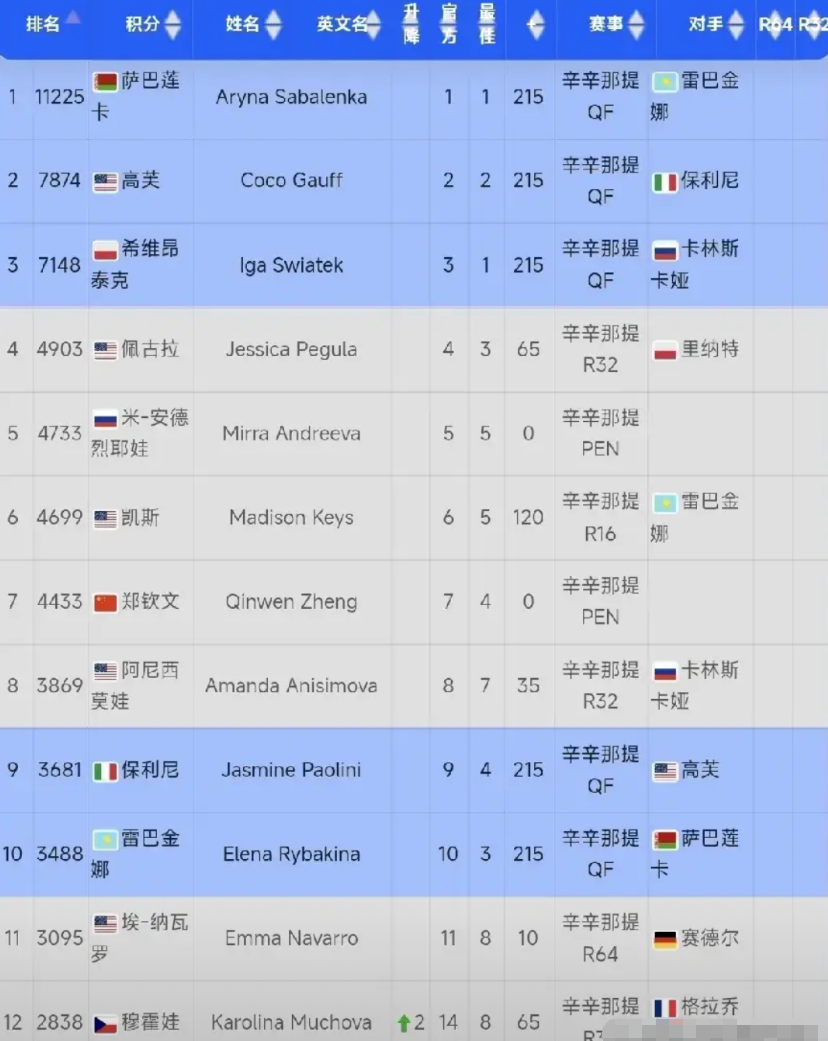 目前最新的世界排名,她以4433分占据着第七位,排名之后有阿尼西莫娃、保利尼、莱巴金娜,后面两位正在参加辛辛那提1000赛,最新消息是她们已经打进了八强,好消息是1/4决赛保利尼对阵高芙,莱巴金娜对阵萨巴伦卡,都是硬茬子,获胜几率微乎其微。