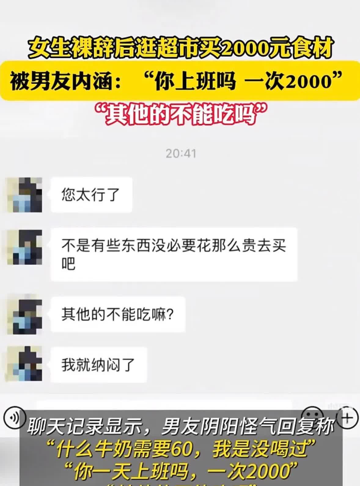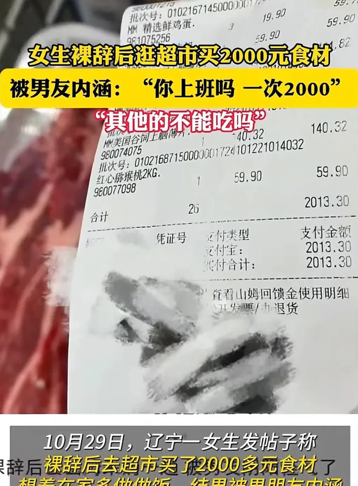 辽宁大连,女生裸辞后在家没事干,就去逛山姆超市,一口气买了2000多块的食材。没想到,男友看完账单后阴阳怪气地质问女子:你上班吗?一次花2000元?什么牛奶要60块?有些东西没必要花那么贵去买吧!女子听后委屈极了,说我花自己攒的钱给咱俩买平时要吃的食材,也有错吗? 辽宁大连的李佳诺姑娘,辞了工作在家待着,想着趁这个机会把厨艺提升一下,让每天辛苦上班的男朋友回来后能吃上口热乎饭。于是,她特意去办了张山姆超市的会员卡,一口气买了够两个人吃一个月的食材,总共花了2013块钱。什么牛奶啊、三盒牛肉啊、还有90个鸡蛋之类的,她都精打细算地挑着,就想让两人吃得健康点儿。买完东西,她兴冲冲地把账单拍照发给男友,本想让他夸夸自己,结果男友却发来一连串阴阳怪气的话:“你又不上班,一下花两千多?牛奶一瓶就要60?就不能买便宜点的?”这话让李佳诺心里特别不是滋味。毕竟她花的是自己攒的钱,一分没动男友的,就是想为这个小家多做点贡献,没想到会得到这样的回应。她开始琢磨,两人是不是消费观念根本就不合啊。 李佳诺把这事儿发到了网上,一下子引起了大家的热议。有人挺她,说钱是她自己的,想怎么花就怎么花;也有人觉得,两人观念差这么多,以后日子可咋过。从法律上来说,《民法典》规定了,她有权自由处理自己的财产,男友管不着。但感情这事儿啊,光靠法律可不行。