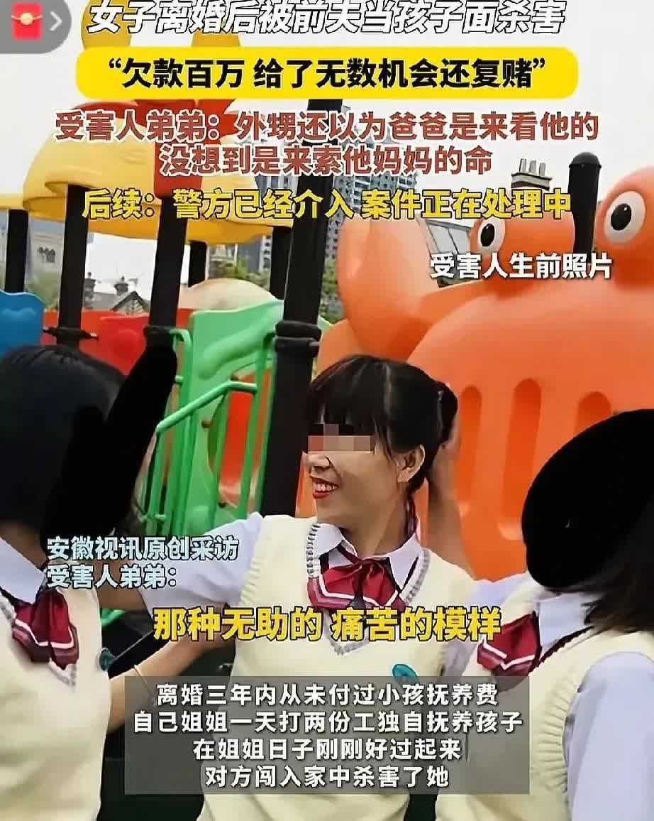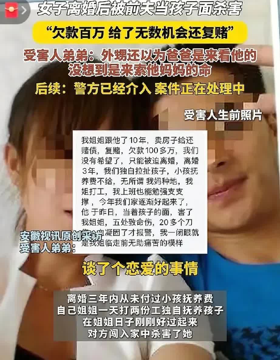 8月10日晚,山东临沂34岁女子在家中,被前夫彭某当着11岁儿子的面,残忍杀害。 她和前夫是相亲认识的,结婚十年育有一个孩子。原以为能安稳度日,没成想丈夫沉迷赌博,到处欠债。她心疼孩子,咬牙卖掉房子帮他还了30万赌债,本以为能换他回头,结果对方死性不改,三次复赌把欠款直接飙到100多万。这样看不到希望的日子,换谁都撑不下去,她最终选择了离婚。 离婚后她一个人带着孩子,白天当幼师,晚上还得打份零工,再苦再累都没喊过冤,就想靠自己给孩子挣个安稳未来。今年好不容易通过相亲遇到个好男人,对方不嫌弃她离婚带娃,两个人处得挺好,眼看日子要熬出头了,没成想厄运突然降临。 8月10号那天,前夫借着买零食看孩子的借口,闯进家门当着孩子的面下了狠手,连捅二十多刀,造成15处轻伤5处重伤。就因为离婚三年后她找到了幸福,这就成了被杀的理由? 有孩子确实难彻底断联,但遇到这种极端偏执的人,真的要把安全刻在心上。希望法律能严惩凶手,还她一个公道!