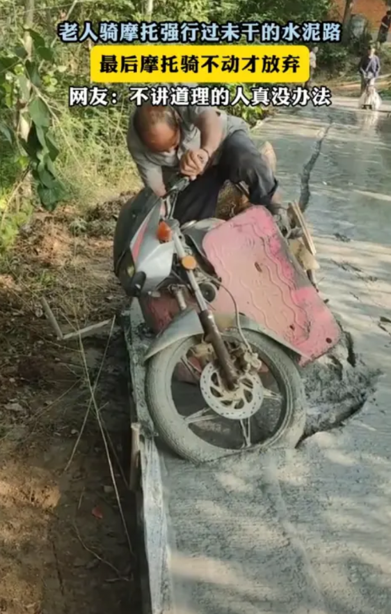 “太缺德了!”8月14日,湖北襄阳,一老人骑摩托车路过刚浇筑好的水泥路,突然掉转车头开了上去,工人见状急忙上前阻拦,可老人丝毫不听,自顾自的往前开,直到摩托车陷进水泥骑不动才停下!工人无奈只能返工修复。网友:让他赔偿损失!