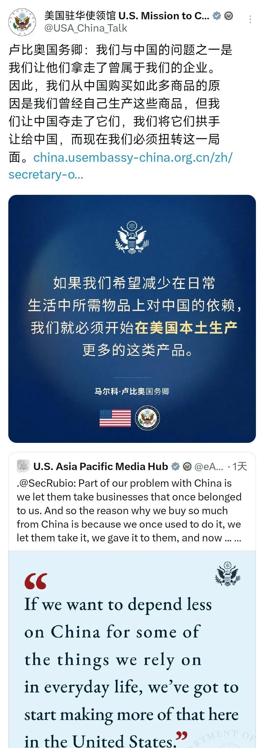 美国驻华使领馆昨晚(8月14日)写道:“鲁比奥国务卿:我们与中国的问题之一是我们让他们拿走了曾属于我们的企业。因此,我们从中国购买如此多商品的原因是我们曾经自己生产这些产品,但我们让中国夺走了它们,我们将它们拱手让给中国,而现在我们必须扭转这一局面。” 即使是美国建制派高官,很少有人对美国社会存在的问题进行反思,沙利文、鲁比奥可谓美国建制派精英中精英。鲁比奥把时间段提前到上世纪九十年代初似有不妥,因为克林顿是美国自1962年至今唯一一位将美国财政实现盈余的总统。真正制造业大幅流失从小布什开始,到奥巴马执政后期才到惨不忍睹的状况,所以他提出“再工业化”、特朗普1.0提出“制造业回流”、拜登则提出“振兴制造业”计划,但十多年来美国制造业非但未予回流,现存的制造业也每况愈下。对于制造业流失问题不仅仅只是美国,整个西方世界皆是如此。 现在鲁比奥有三个没想到:一是没想到美国的制造业流失速度和中国的制造业发展速度之快;二是当美国人享受着中国物美价廉商品的同时,没想到中国从价值链低端进行创新而走到了价值链乃至供应链的高端;三是美国希望用资本主义改造中国,没想到中国改造了资本主义。 二十七年前克林顿访华时说,希望中国成为一个开放、交流、对话的中国;去年布林肯访华时,我们也告诉他,中方乐见一个自信开放、繁荣发展的美国。三十年河东三十年河西,世事盛衰兴替,变化无常,怎不让我们感慨万千!