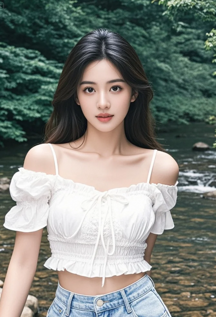溪水潺潺,绿衫少女与白鸭嬉戏,定格这夏日溪边的惬意时光。