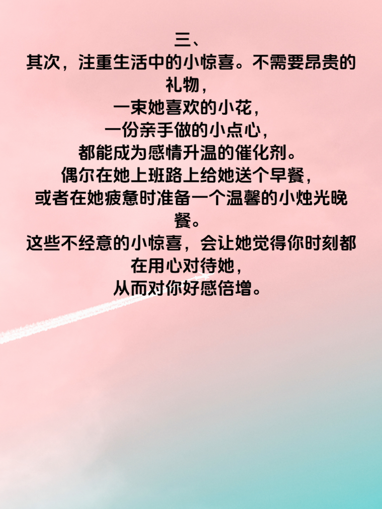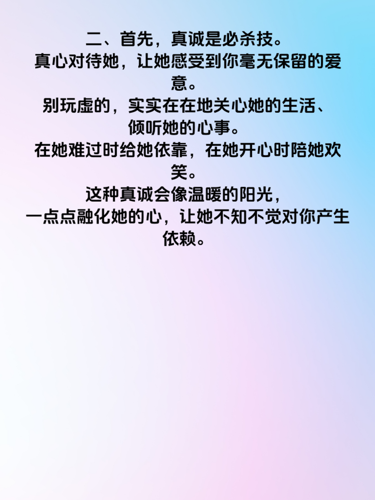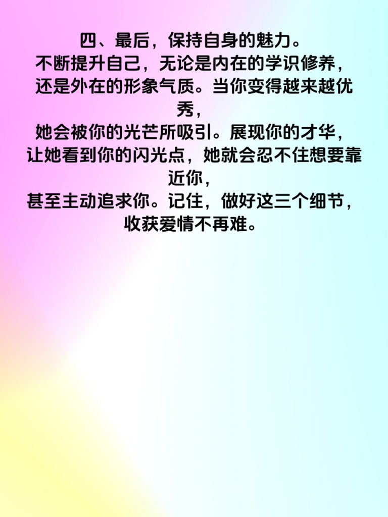 一、追求女生时,细节往往决定成败。想要让她主动追求你,这三个细节一定要把握好。 二、首先,真诚是必杀技。真心对待她,让她感受到你毫无保留的爱意。别玩虚的,实实在在地关心她的生活、倾听她的心事。在她难过时给她依靠,在她开心时陪她欢笑。这种真诚会像温暖的阳光,一点点融化她的心,让她不知不觉对你产生依赖。 三、其次,注重生活中的小惊喜。不需要昂贵的礼物,一束她喜欢的小花,一份亲手做的小点心,都能成为感情升温的催化剂。偶尔在她上班路上给她送个早餐,或者在她疲惫时准备一个温馨的小烛光晚餐。这些不经意的小惊喜,会让她觉得你时刻都在用心对待她,从而对你好感倍增。 四、最后,保持自身的魅力。不断提升自己,无论是内在的学识修养,还是外在的形象气质。当你变得越来越优秀,她会被你的光芒所吸引。展现你的才华,让她看到你的闪光点,她就会忍不住想要靠近你,甚至主动追求你。记住,做好这三个细节,收获爱情不再难。
