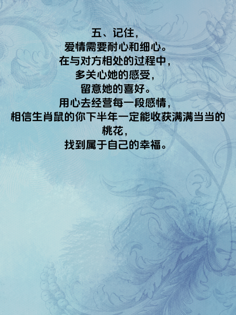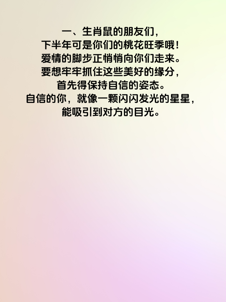 一、生肖鼠的朋友们,下半年可是你们的桃花旺季哦!爱情的脚步正悄悄向你们走来。要想牢牢抓住这些美好的缘分,首先得保持自信的姿态。自信的你,就像一颗闪闪发光的星星,能吸引到对方的目光。 二、主动出击也很关键。不要总是等待爱情降临,勇敢地去结识新的朋友。参加一些社交活动,拓展自己的社交圈,说不定心仪的那个她就在某个角落等着你呢。 三、注重自身形象也必不可少。干净整洁的外表,得体的穿着打扮,会给人留下良好的第一印象。让自己时刻保持清爽利落,展现出最好的一面。 四、聊天时要真诚且有趣。用心倾听对方的想法,分享自己的生活点滴,偶尔开个小玩笑,营造轻松愉快的氛围。这样能迅速拉近你们之间的距离。 五、记住,爱情需要耐心和细心。在与对方相处的过程中,多关心她的感受,留意她的喜好。用心去经营每一段感情,相信生肖鼠的你下半年一定能收获满满当当的桃花,找到属于自己的幸福。